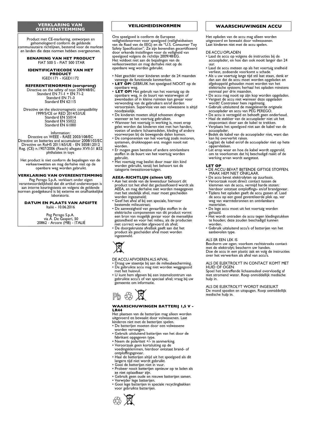 Italië - 10.06.2016 Peg Perego S.p.A. via A. De Gasperi, 50 20862 - Arcore (MB) - ITALIË VERKLARING VAN OVEREENSTEMMING Ons speelgoed is conform de Europese veiligheidsnormen voor speelgoed (veiligheidseisen van de Raad van de EEG) en de “U.S. Consumer Toy Safety Specification”. Ze zijn bovendien gecertificeerd door erkende instellingen voor de veiligheid van speelgoed volgens de richtlijn 2009/48/EG. Het voldoet niet aan de bepalingen van de verkeerswetten en mag derhalve niet op de openbare weg worden gebruikt.