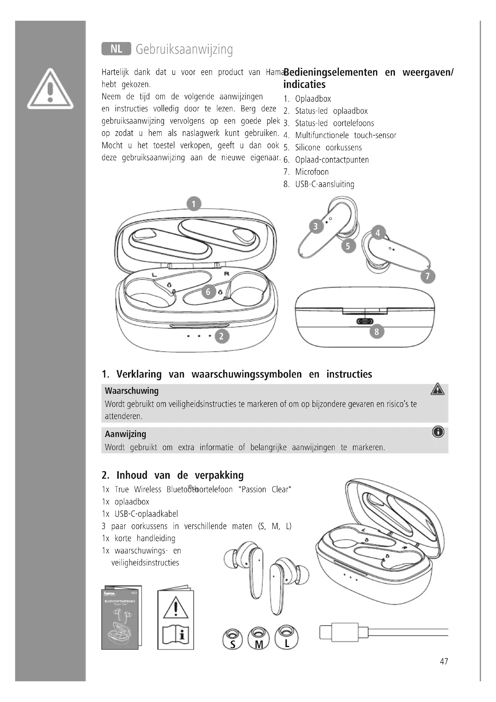 Por la presente, la empresa Hama GmbH & Co KG declara que el tipo de equipo radioeléctrico [00184078, 00184079] es conforme con la Directiva 2014/53/UE El texto completo de la declaración UE de conformidad está disponible en la siguiente dirección de Internet: wwwhamacom ->00184078, 00184079->Downloads Banda o bandas de frecuencia 2402MHz – 2480 MHz Potencia máxima de radiofrecuencia 25mW47 N Gebruiksaanwijzing Hartelijk dank dat u voor een product van Hama hebt gekozen Neem de tijd om de volgende aanwijzingen en instructies volledig door te lezen Berg deze gebruiksaanwijzing vervolgens op een goede plek op zodat u hem als naslagwerk kunt gebruiken Mocht u het toestel verkopen, geeft u dan ook deze gebruiksaanwijzing aan de nieuwe eigenaar Bedieningselementen en weergaven/ indicaties 1 Oplaadbox 2 Status-led oplaadbox 3 Status-led oortelefoons 4 Multifunctionele touch-sensor 5 Silicone oorkussens 6 Oplaad-contactpunten 7 Microfoon 8 USB-C-aansluiting