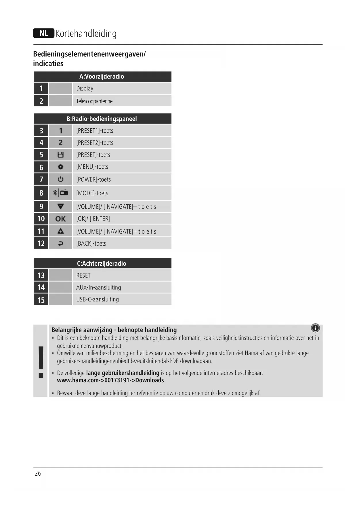 - Omwille van milieubescherming en het besparen van waardevolle grondstoffen ziet Hama af van gedrukte lange gebruikershandleidingen en biedt deze uitsluitend als PDF-download aan.