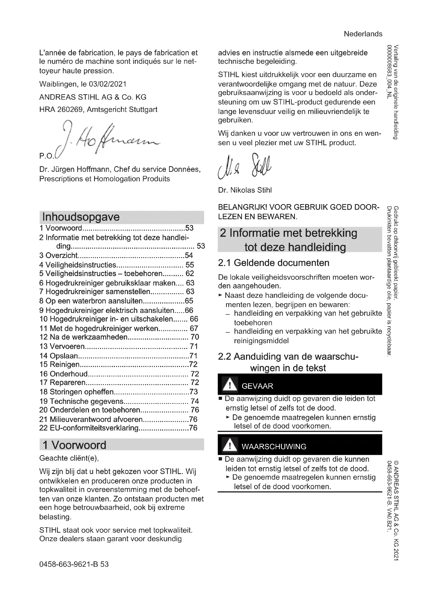 - Niveau de puissance acoustique garanti : 87 dB(A) Conservation des documents techniques : ANDREAS STIHL AG & Co. KG Produktzulas‐ sung. français 20 Pièces de rechange et accessoires 52 0458-663-9621-BL'année de fabrication, le pays de fabrication et le numéro de machine sont indiqués sur le net‐ toyeur haute pression. Waiblingen, le 03/02/2021 ANDREAS STIHL AG & Co. KG HRA 260269, Amtsgericht Stuttgart P.O. Dr. Jürgen Hoffmann, Chef du service Données, Prescriptions et Homologation Produits Inhoudsopgave 1 Voorwoord p. 53