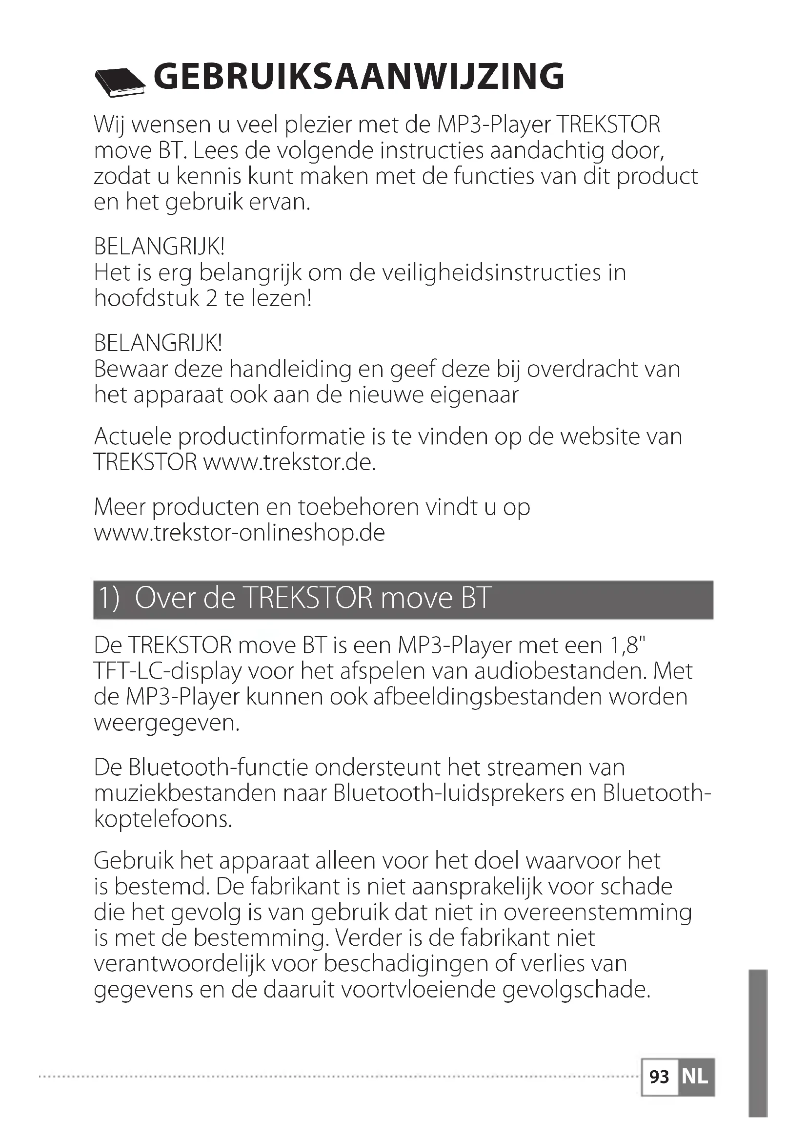 GEBRUIKSAANWIJZING Wij wensen u veel plezier met de MP3-Player TREKSTOR move BT. Lees de volgende instructies aandachtig door, zodat u kennis kunt maken met de functies van dit product en het gebruik ervan. BELANGRIJK! Het is erg belangrijk om de veiligheidsinstructies in hoofdstuk 2 te lezen! BELANGRIJK! Bewaar deze handleiding en geef deze bij overdracht van het apparaat ook aan de nieuwe eigenaar Actuele productinformatie is te vinden op de website van TREKSTOR www.trekstor.de. Meer producten en toebehoren vindt u op www.trekstor-onlineshop.de