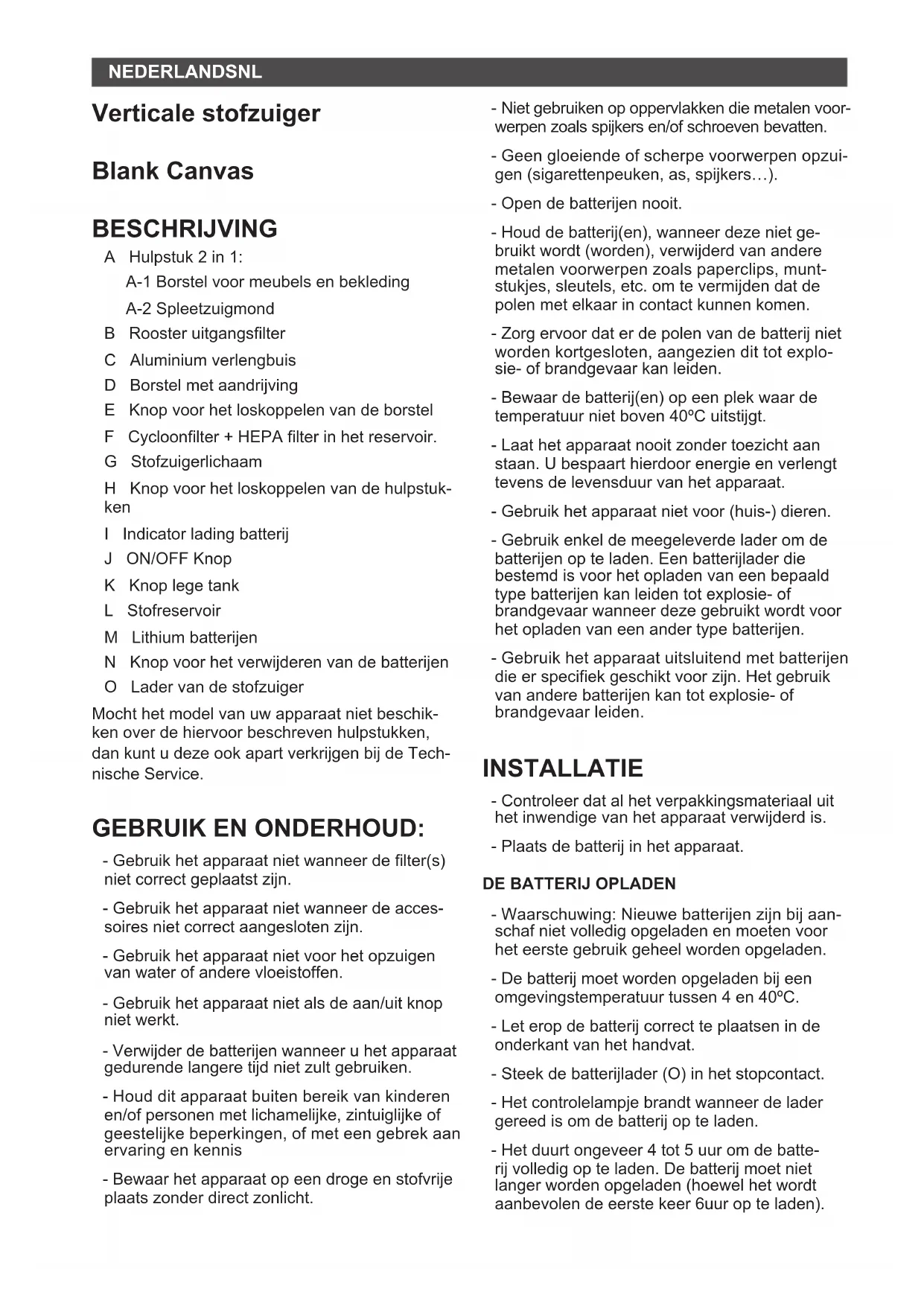 L’INTERIOR DE L’APARELL: - Advertiment: És important que les bateries es trobin completament descarregades abans de procedir a la seva retirada de l’aparell. - Advertiment: l’aparell ha d’estar desconnectat de l’alimentació quan es retirin les bateries. PER A RETIRAR LES BATERIES, UNA VEGA- DA FINALITZADA LA VIDA DE L’APARELL, PROCEDIR COM SEGUEIX: - Pressionar el botó d’extracció de la bateria i estirar la bateria fora del cos de l’aspirador. (Fig. 8)NEDERLANDS NL Verticale stofzuiger Blank Canvas BESCHRIJVING A Hulpstuk 2 in 1: A-1 Borstel voor meubels en bekleding A-2 Spleetzuigmond B Rooster uitgangslter C Aluminium verlengbuis D Borstel met aandrijving E Knop voor het loskoppelen van de borstel F Cycloonlter + HEPA lter in het reservoir. G Stofzuigerlichaam H Knop voor het loskoppelen van de hulpstuk- ken I Indicator lading batterij J ON/OFF Knop K Knop lege tank L Stofreservoir M Lithium batterijen N Knop voor het verwijderen van de batterijen O Lader van de stofzuiger Mocht het model van uw apparaat niet beschik- ken over de hiervoor beschreven hulpstukken, dan kunt u deze ook apart verkrijgen bij de Tech- nische Service. GEBRUIK EN ONDERHOUD: - Gebruik het apparaat niet wanneer de lter(s) niet correct geplaatst zijn. - Gebruik het apparaat niet wanneer de acces- soires niet correct aangesloten zijn. - Gebruik het apparaat niet voor het opzuigen van water of andere vloeistoffen. - Gebruik het apparaat niet als de aan/uit knop niet werkt. - Verwijder de batterijen wanneer u het apparaat gedurende langere tijd niet zult gebruiken. - Houd dit apparaat buiten bereik van kinderen en/of personen met lichamelijke, zintuiglijke of geestelijke beperkingen, of met een gebrek aan ervaring en kennis - Bewaar het apparaat op een droge en stofvrije plaats zonder direct zonlicht. - Niet gebruiken op oppervlakken die metalen voor- werpen zoals spijkers en/of schroeven bevatten. - Geen gloeiende of scherpe voorwerpen opzui- gen (sigarettenpeuken, as, spijkers…). - Open de batterijen nooit. - Houd de batterij(en), wanneer deze niet ge- bruikt wordt (worden), verwijderd van andere metalen voorwerpen zoals paperclips, munt- stukjes, sleutels, etc. om te vermijden dat de polen met elkaar in contact kunnen komen. - Zorg ervoor dat er de polen van de batterij niet worden kortgesloten, aangezien dit tot explo- sie- of brandgevaar kan leiden. - Bewaar de batterij(en) op een plek waar de temperatuur niet boven 40ºC uitstijgt. - Laat het apparaat nooit zonder toezicht aan staan. U bespaart hierdoor energie en verlengt tevens de levensduur van het apparaat. - Gebruik het apparaat niet voor (huis-) dieren. - Gebruik enkel de meegeleverde lader om de batterijen op te laden. Een batterijlader die bestemd is voor het opladen van een bepaald type batterijen kan leiden tot explosie- of brandgevaar wanneer deze gebruikt wordt voor het opladen van een ander type batterijen. - Gebruik het apparaat uitsluitend met batterijen die er speciek geschikt voor zijn. Het gebruik van andere batterijen kan tot explosie- of brandgevaar leiden. INSTALLATIE - Controleer dat al het verpakkingsmateriaal uit het inwendige van het apparaat verwijderd is. - Plaats de batterij in het apparaat.