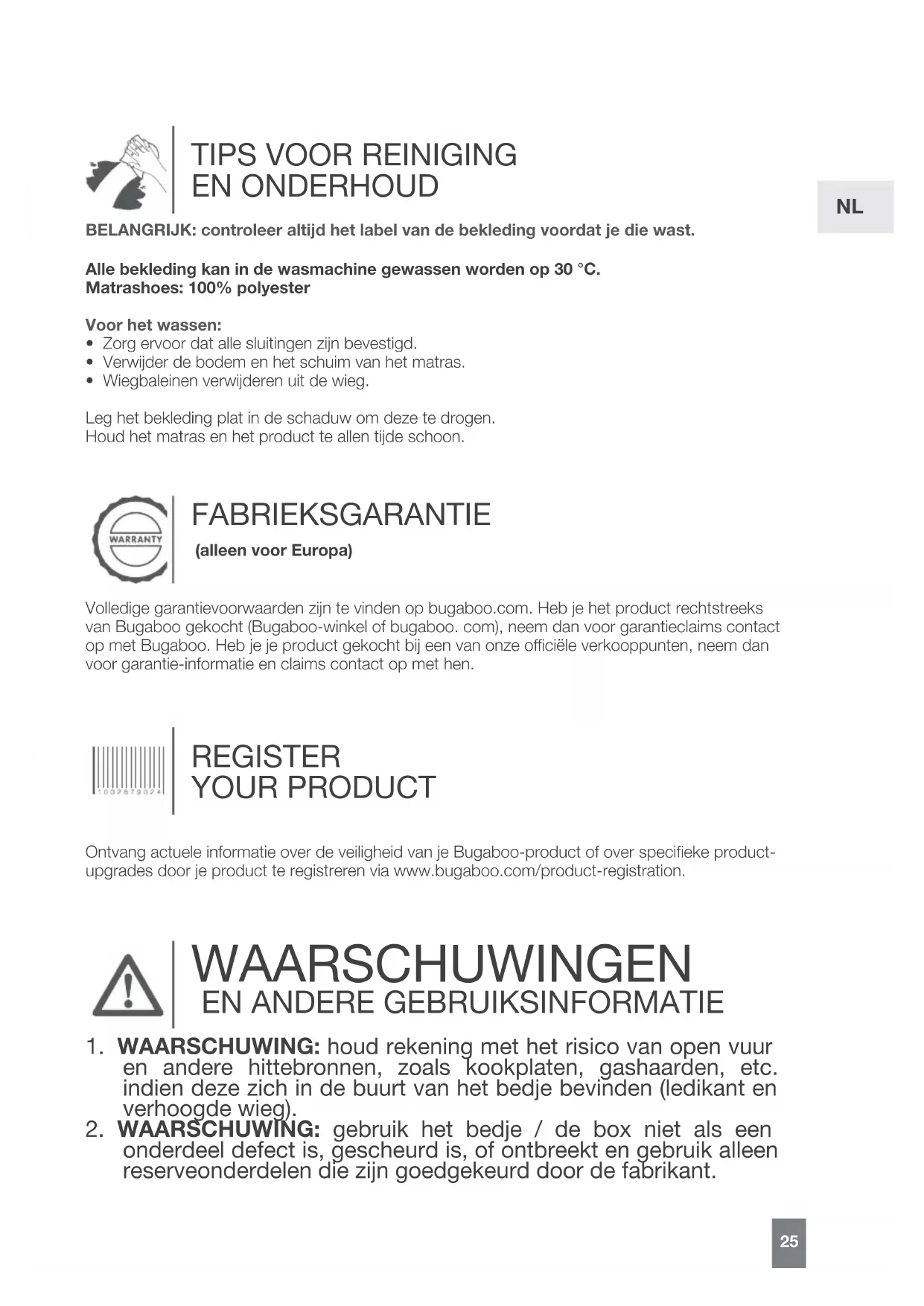 FABRIEKSGARANTIE (alleen voor Europa) Volledige garantievoorwaarden zijn te vinden op bugaboo.com. Heb je het product rechtstreeks van Bugaboo gekocht (Bugaboo-winkel of bugaboo. com), neem dan voor garantieclaims contact op met Bugaboo. Heb je je product gekocht bij een van onze ociële verkooppunten, neem dan voor garantie-informatie en claims contact op met hen. REGISTER YOUR PRODUCT Ontvang actuele informatie over de veiligheid van je Bugaboo-product of over specieke product- upgrades door je product te registreren via www.bugaboo.com/product-registration.