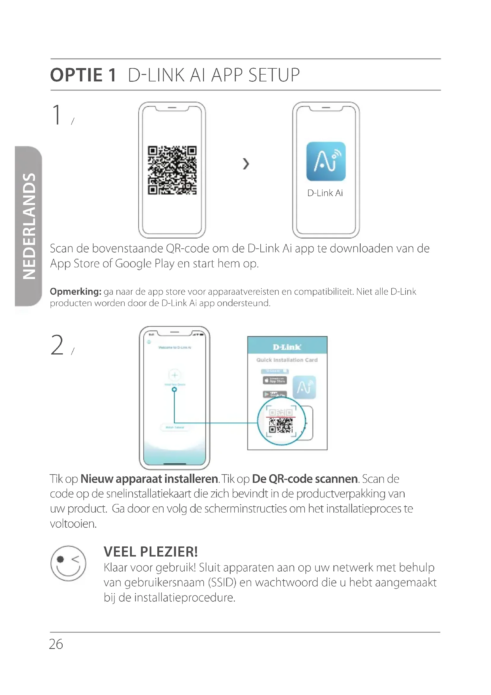 VEEL PLEZIER! Klaar voor gebruik! Sluit apparaten aan op uw netwerk met behulp van gebruikersnaam (SSID) en wachtwoord die u hebt aangemaakt bij de installatieprocedure. D-Link AiQuick Installation Card “D-Link Ai ” Model Name: DEVICE Wi-Fi Name: E15-XXXX Password: XXXXXXXX
