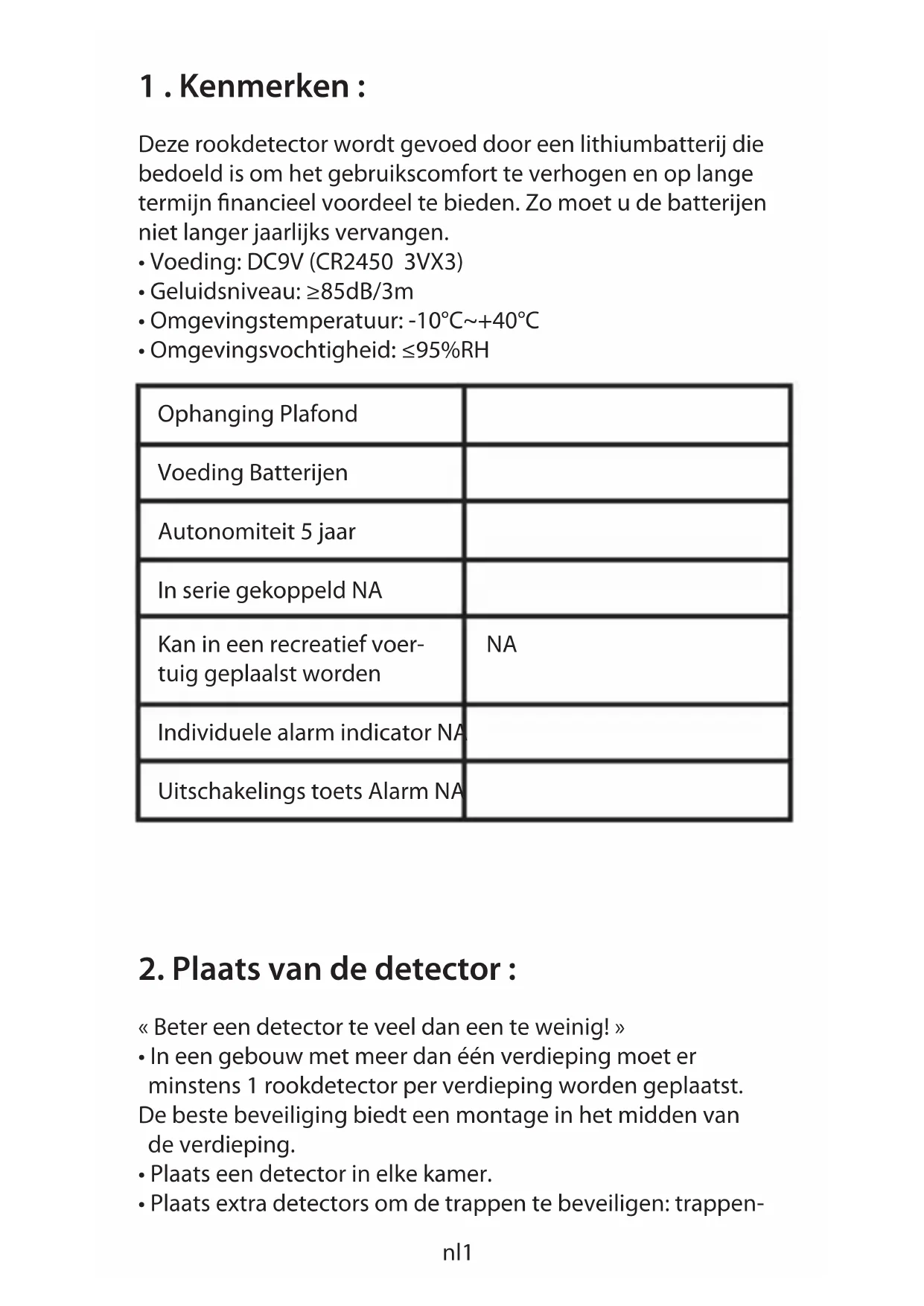 - Plaats extra detectors om de trappen te beveiligen: trappen- nl1 Ophanging Plafond Voeding Batterijen Autonomiteit 5 jaar In serie gekoppeld NA Kan in een recreatief voer- tuig geplaalst worden