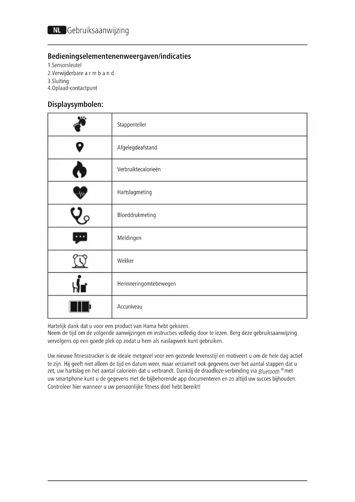 Displaysymbolen: Stappenteller Afgelegde afstand Verbruikte calorieën Hartslagmeting Bloeddrukmeting Meldingen Wekker Herinnering om te bewegen Accuniveau Hartelkdank dat uvoor een product van Hama hebt gekozen. Neem de tdomdevolgende aanwzingen en instructies volledig door te lezen. Bergdeze gebruiksaanwzing vervolgens op een goede plek op zodat uhem als naslagwerk kunt gebruiken. Uw nieuwe tnesstracker is de ideale metgezel voor een gezonde levensstlenmotiveert uomdehele dag actief te zn. H geeft niet alleen de tdendatum weer,maar verzamelt ook gegevens over het aantal stappen dat u zet, uw hartslag en het aantal calorieën dat uverbrandt. Dankz de draadloze verbinding via Bluetooth