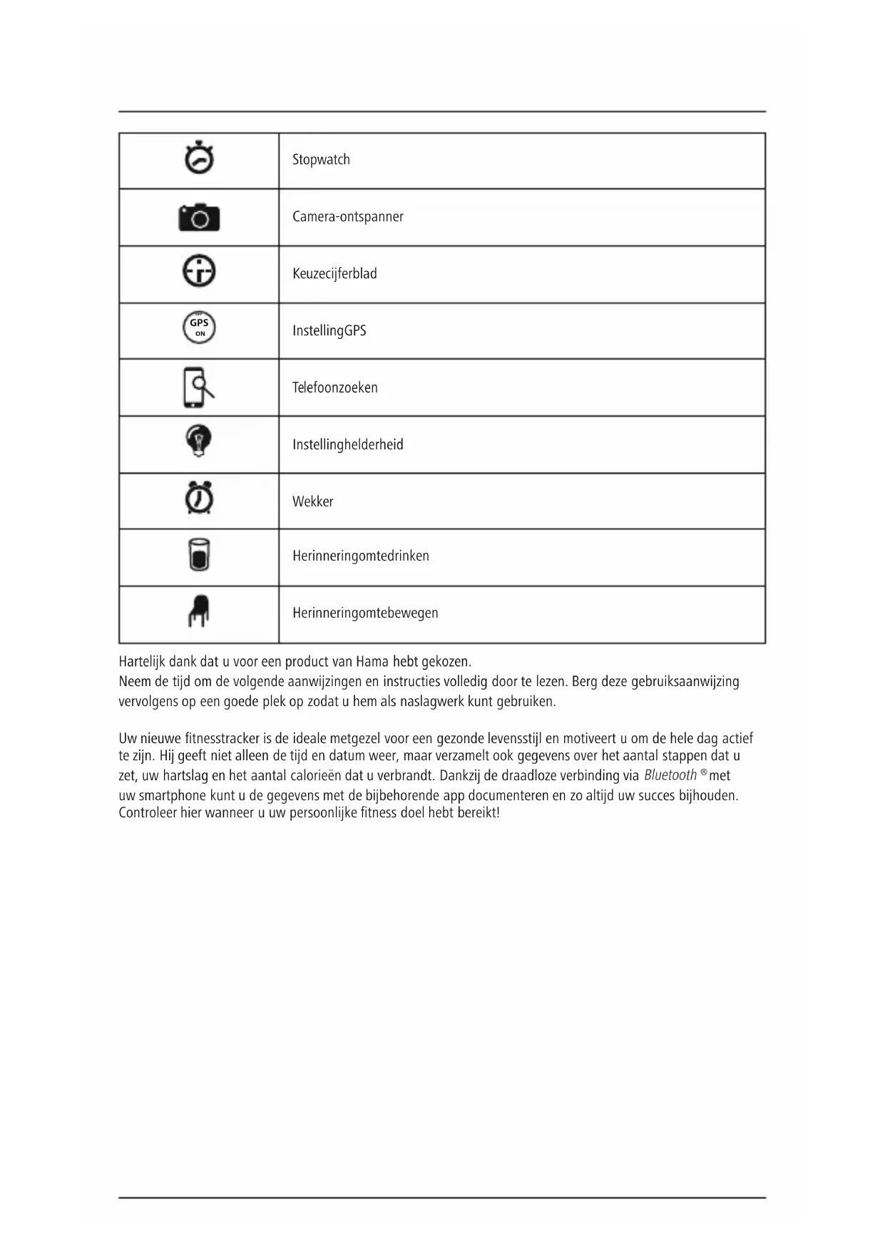 OFF Instelling GPS Telefoon zoeken Instelling helderheid Wekker Herinnering om te drinken Herinnering om te bewegen Hartelkdank dat uvoor een product van Hama hebt gekozen. Neem de tdomdevolgende aanwzingen en instructies volledig door te lezen. Bergdeze gebruiksaanwzing vervolgens op een goede plek op zodat uhem als naslagwerk kunt gebruiken. Uw nieuwe tnesstracker is de ideale metgezel voor een gezonde levensstlenmotiveert uomdehele dag actief te zn. H geeft niet alleen de tdendatum weer,maar verzamelt ook gegevens over het aantal stappen dat u zet, uw hartslag en het aantal calorieën dat uverbrandt. Dankz de draadloze verbinding via Bluetooth