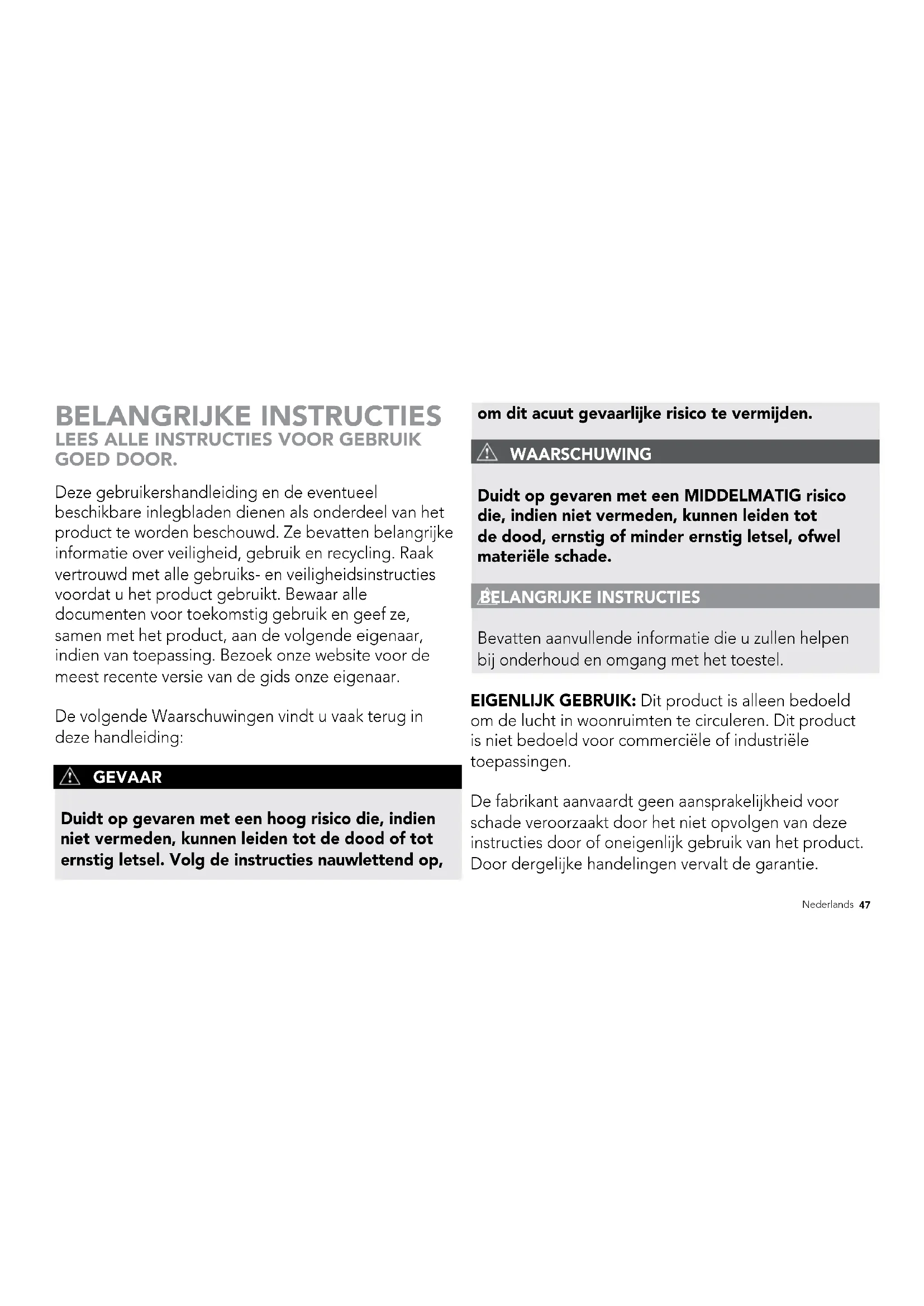 - Garantie Nederlands Deze gebruikershandleiding en de eventueel beschikbare inlegbladen dienen als onderdeel van het product te worden beschouwd. Ze bevatten belangrijke informatie over veiligheid, gebruik en recycling. Raak vertrouwd met alle gebruiks- en veiligheidsinstructies voordat u het product gebruikt. Bewaar alle documenten voor toekomstig gebruik en geef ze, samen met het product, aan de volgende eigenaar, indien van toepassing. Bezoek onze website voor de meest recente versie van de gids onze eigenaar. De volgende Waarschuwingen vindt u vaak terug in deze handleiding: GEVAAR Duidt op gevaren met een hoog risico die, indien niet vermeden, kunnen leiden tot de dood of tot ernstig letsel. Volg de instructies nauwlettend op, om dit acuut gevaarlijke risico te vermijden. WAARSCHUWING Duidt op gevaren met een MIDDELMATIG risico die, indien niet vermeden, kunnen leiden tot de dood, ernstig of minder ernstig letsel, ofwel materiële schade. BELANGRIJKE INSTRUCTIES Bevatten aanvullende informatie die u zullen helpen bij onderhoud en omgang met het toestel. EIGENLIJK GEBRUIK: Dit product is alleen bedoeld om de lucht in woonruimten te circuleren. Dit product is niet bedoeld voor commerciële of industriële toepassingen. De fabrikant aanvaardt geen aansprakelijkheid voor schade veroorzaakt door het niet opvolgen van deze instructies door of oneigenlijk gebruik van het product. Door dergelijke handelingen vervalt de garantie. BELANGRIJKE INSTRUCTIES p. 5947