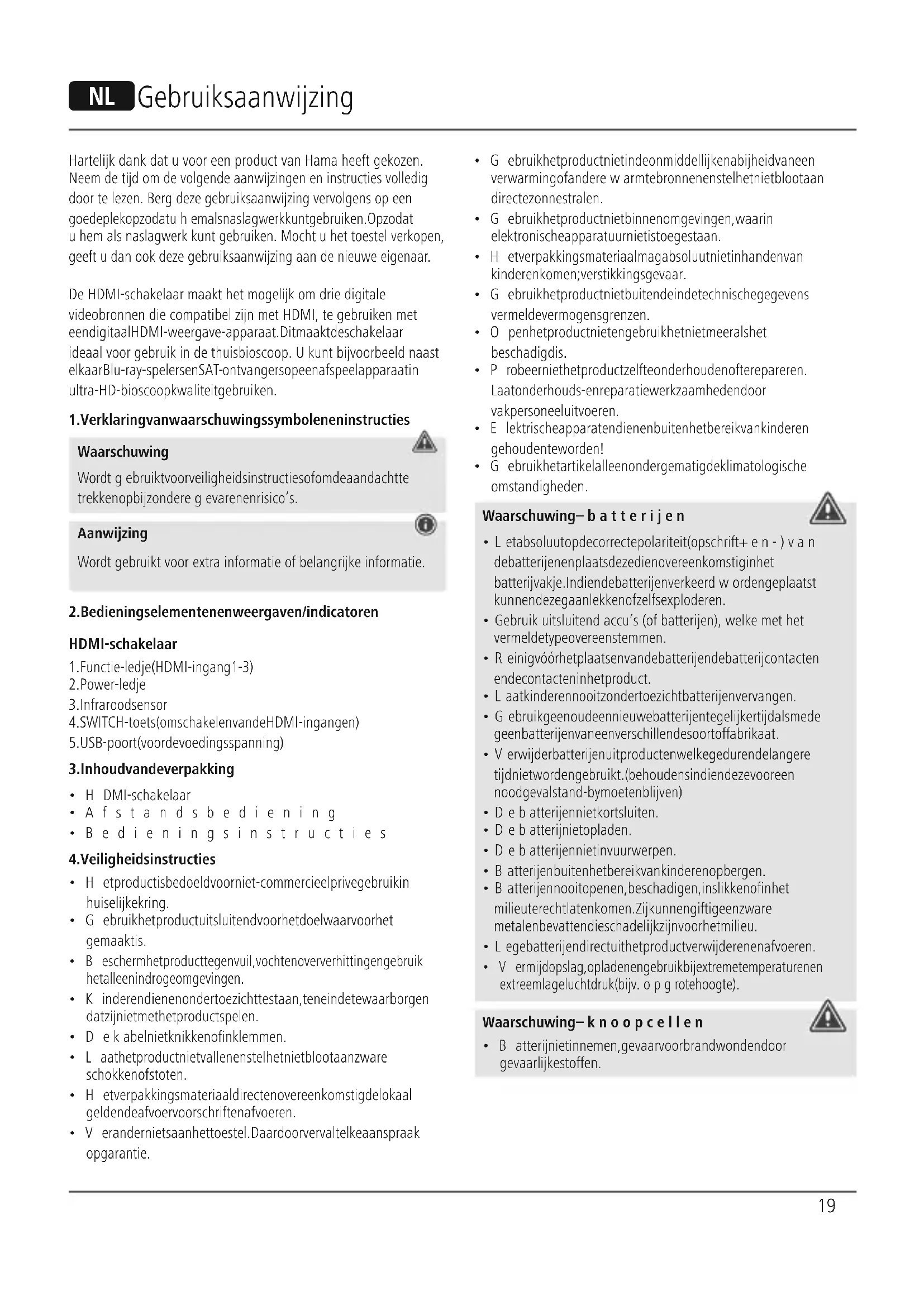 Informazioni per protezione ambientale: Dopo l’implementazione della Direttiva Europea 2012/19/EU e2006/66/EU nel sistema legale nazionale, ci sono le seguenti applicazioni: Le apparecchiatureelettriche ed elettroniche elebatterie non devono esseresmaltite con iriuti domestici. I consumatori sono obbligati dalla legge arestituireI dispositivi elettrici ed elettronici elebatterie alla ne della lorovita utile ai punti di raccolta pubblici preposti per questo scopo onei punti vendita. Dettagli di quanto riportato sono deniti dalle leggi nazionali di ogni stato. Questo simbolo sul prodotto, sul manuale d’istruzioni osull’imballo indicano che questo prodotto èsoggetto aqueste regole. Riciclando, ri-utilizzando imateriali outilizzando sotto altraforma ivecchi prodotti/le batterie, darete un importante contributo alla protezione dell’ambiente.19 N Gebruiksaanwijzing Hartelkdank dat uvoor een product van Hama heeft gekozen. Neem de tdomdevolgende aanwzingen en instructies volledig door te lezen. Bergdeze gebruiksaanwzing vervolgens op een goede plek op zodat uhem als naslagwerk kunt gebruiken. Op zodat uhem als naslagwerk kunt gebruiken. Mocht uhet toestel verkopen, geeft udan ook deze gebruiksaanwzing aan de nieuwe eigenaar. De HDMI-schakelaar maakt het mogelkomdrie digitale videobronnen die compatibel znmet HDMI, te gebruiken met een digitaal HDMI-weergave-apparaat. Dit maakt de schakelaar ideaal voor gebruik in de thuisbioscoop. Ukunt bvoorbeeld naast elkaar Blu-ray-spelers en SAT-ontvangers op een afspeelapparaat in ultra-HD-bioscoopkwaliteit gebruiken.