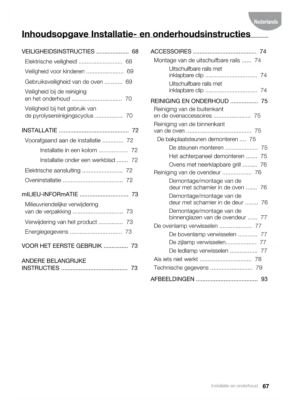 - Diese Informationen finden Sie auf dem Typen- schild seitlich in Ihrem Backofen, das Sie se- hen, wenn Sie die Tür öffnen.67 Installatie en onderhoud Nederlands Inhoudsopgave Installatie- en onderhoudsinstructies vEIlIGhEIDSINSTRUCTIES p. 68