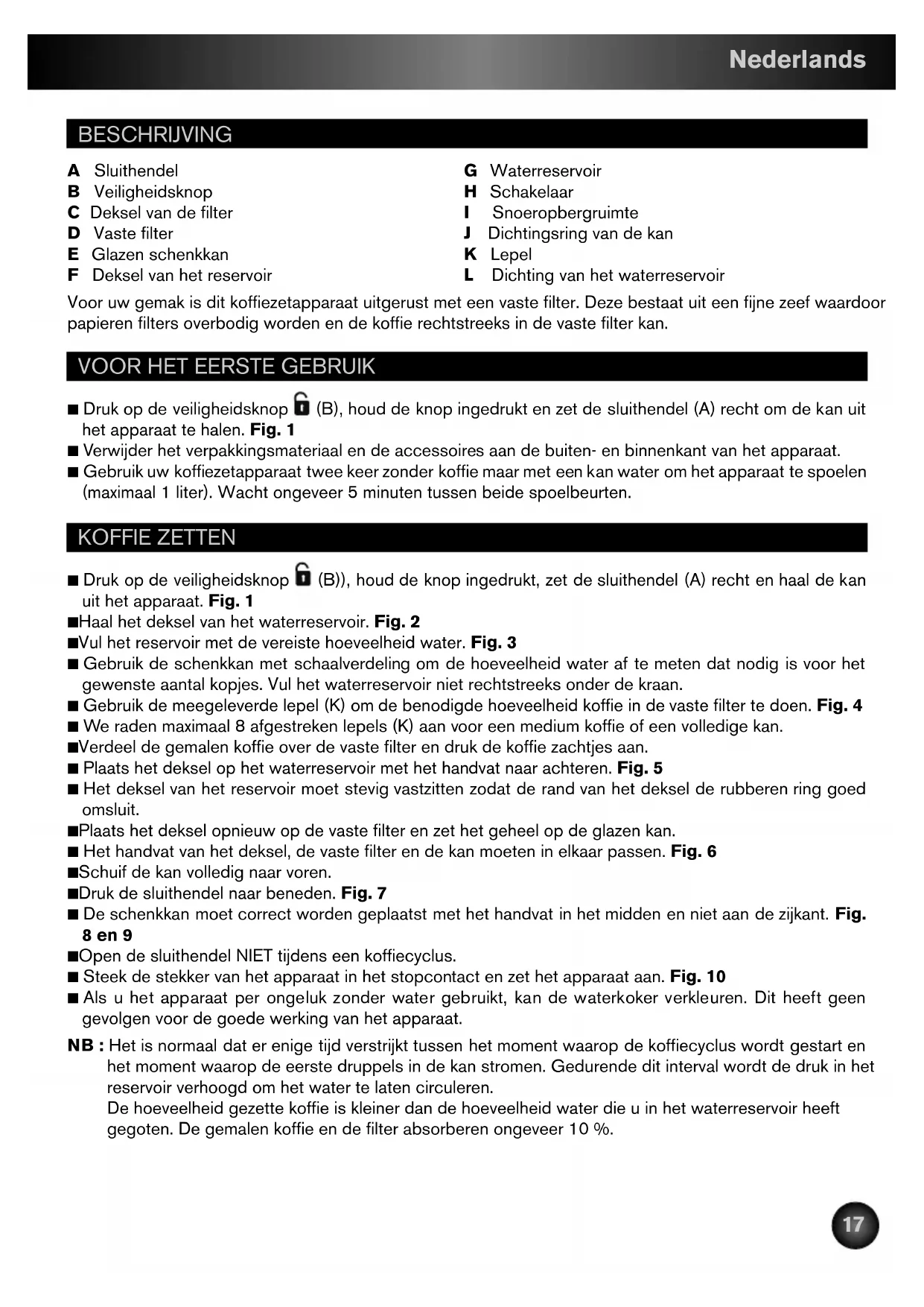 ■ Druk op de veiligheidsknop (B), houd de knop ingedrukt en zet de sluithendel (A) recht om de kan uit het apparaat te halen. Fig. 1 ■ Verwijder het verpakkingsmateriaal en de accessoires aan de buiten- en binnenkant van het apparaat. ■ Gebruik uw koffiezetapparaat twee keer zonder koffie maar met een kan water om het apparaat te spoelen (maximaal 1 liter). Wacht ongeveer 5 minuten tussen beide spoelbeurten. KOFFIE ZETTEN ■ Druk op de veiligheidsknop (B)), houd de knop ingedrukt, zet de sluithendel (A) recht en haal de kan uit het apparaat. Fig. 1 ■ Haal het deksel van het waterreservoir. Fig. 2 ■ Vul het reservoir met de vereiste hoeveelheid water. Fig. 3 ■ Gebruik de schenkkan met schaalverdeling om de hoeveelheid water af te meten dat nodig is voor het gewenste aantal kopjes. Vul het waterreservoir niet rechtstreeks onder de kraan. ■ Gebruik de meegeleverde lepel (K) om de benodigde hoeveelheid koffie in de vaste filter te doen. Fig. 4 ■ We raden maximaal 8 afgestreken lepels (K) aan voor een medium koffie of een volledige kan. ■ Verdeel de gemalen koffie over de vaste filter en druk de koffie zachtjes aan. ■ Plaats het deksel op het waterreservoir met het handvat naar achteren. Fig. 5 ■ Het deksel van het reservoir moet stevig vastzitten zodat de rand van het deksel de rubberen ring goed omsluit. ■ Plaats het deksel opnieuw op de vaste filter en zet het geheel op de glazen kan. ■ Het handvat van het deksel, de vaste filter en de kan moeten in elkaar passen. Fig. 6 ■ Schuif de kan volledig naar voren. ■ Druk de sluithendel naar beneden. Fig. 7 ■ De schenkkan moet correct worden geplaatst met het handvat in het midden en niet aan de zijkant. Fig. 8 en 9 ■ Open de sluithendel NIET tijdens een koffiecyclus. ■ Steek de stekker van het apparaat in het stopcontact en zet het apparaat aan. Fig. 10 ■ Als u het apparaat per ongeluk zonder water gebruikt, kan de waterkoker verkleuren. Dit heeft geen gevolgen voor de goede werking van het apparaat. NB : Het is normaal dat er enige tijd verstrijkt tussen het moment waarop de koffiecyclus wordt gestart en het moment waarop de eerste druppels in de kan stromen. Gedurende dit interval wordt de druk in het reservoir verhoogd om het water te laten circuleren. De hoeveelheid gezette koffie is kleiner dan de hoeveelheid water die u in het waterreservoir heeft gegoten. De gemalen koffie en de filter absorberen ongeveer 10 %. A Sluithendel B Veiligheidsknop C Deksel van de filter D Vaste filter E Glazen schenkkan F Deksel van het reservoir G Waterreservoir H Schakelaar I Snoeropbergruimte J Dichtingsring van de kan K Lepel L Dichting van het waterreservoir Nederlands