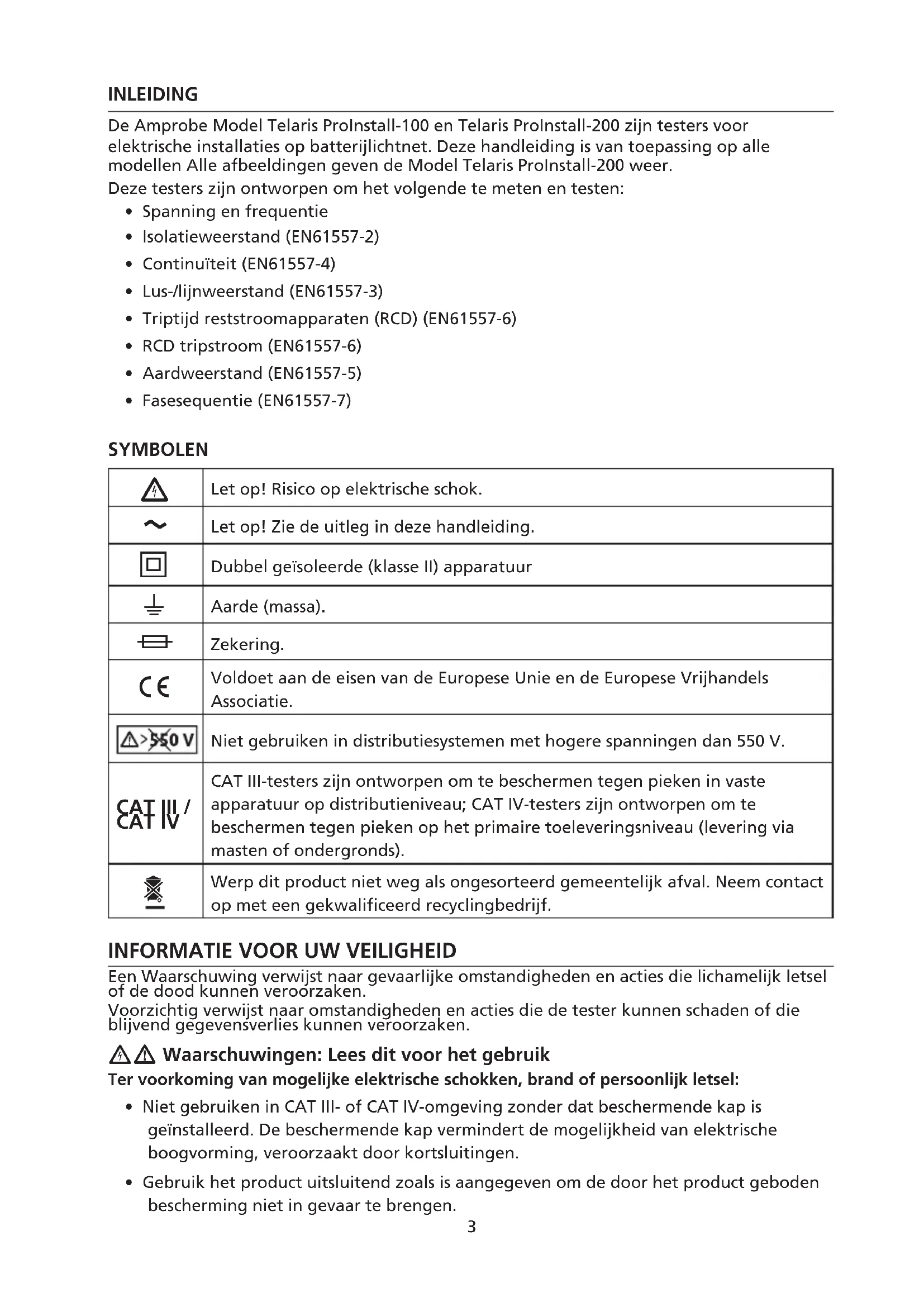 INLEIDINGDe Amprobe Model Telaris ProInstall-100 en Telaris ProInstall-200 zijn testers voor elektrische installaties op batterijlichtnet. Deze handleiding is van toepassing op alle modellen Alle afbeeldingen geven de Model Telaris ProInstall-200 weer.Deze testers zijn ontworpen om het volgende te meten en testen:• Spanning en frequentie• Isolatieweerstand (EN61557-2)• Continuïteit (EN61557-4)• Lus-/lijnweerstand (EN61557-3)• Triptijd reststroomapparaten (RCD) (EN61557-6)• RCD tripstroom (EN61557-6)• Aardweerstand (EN61557-5)• Fasesequentie (EN61557-7)SYMBOLEN Let op! Risico op elektrische schok. Let op! Zie de uitleg in deze handleiding. Dubbel geïsoleerde (klasse II) apparatuur Aarde (massa). Zekering. Voldoet aan de eisen van de Europese Unie en de Europese Vrijhandels Associatie.Niet gebruiken in distributiesystemen met hogere spanningen dan 550 V.CAT III / CAT IVCAT III-testers zijn ontworpen om te beschermen tegen pieken in vaste apparatuur op distributieniveau; CAT IV-testers zijn ontworpen om te beschermen tegen pieken op het primaire toeleveringsniveau (levering via masten of ondergronds). Werp dit product niet weg als ongesorteerd gemeentelijk afval. Neem contact op met een gekwalificeerd recyclingbedrijf.