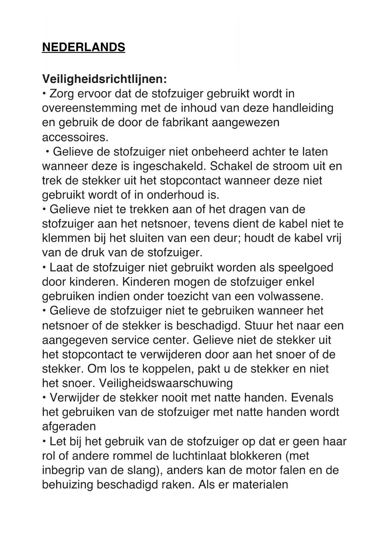 - Gebruik nooit de stofzuiger op ongelijke vloer of de grond; en heel voorzichtig zijn bij het schoonmaken van de trap te voorkomen dat de stofzuiger uitvalt.