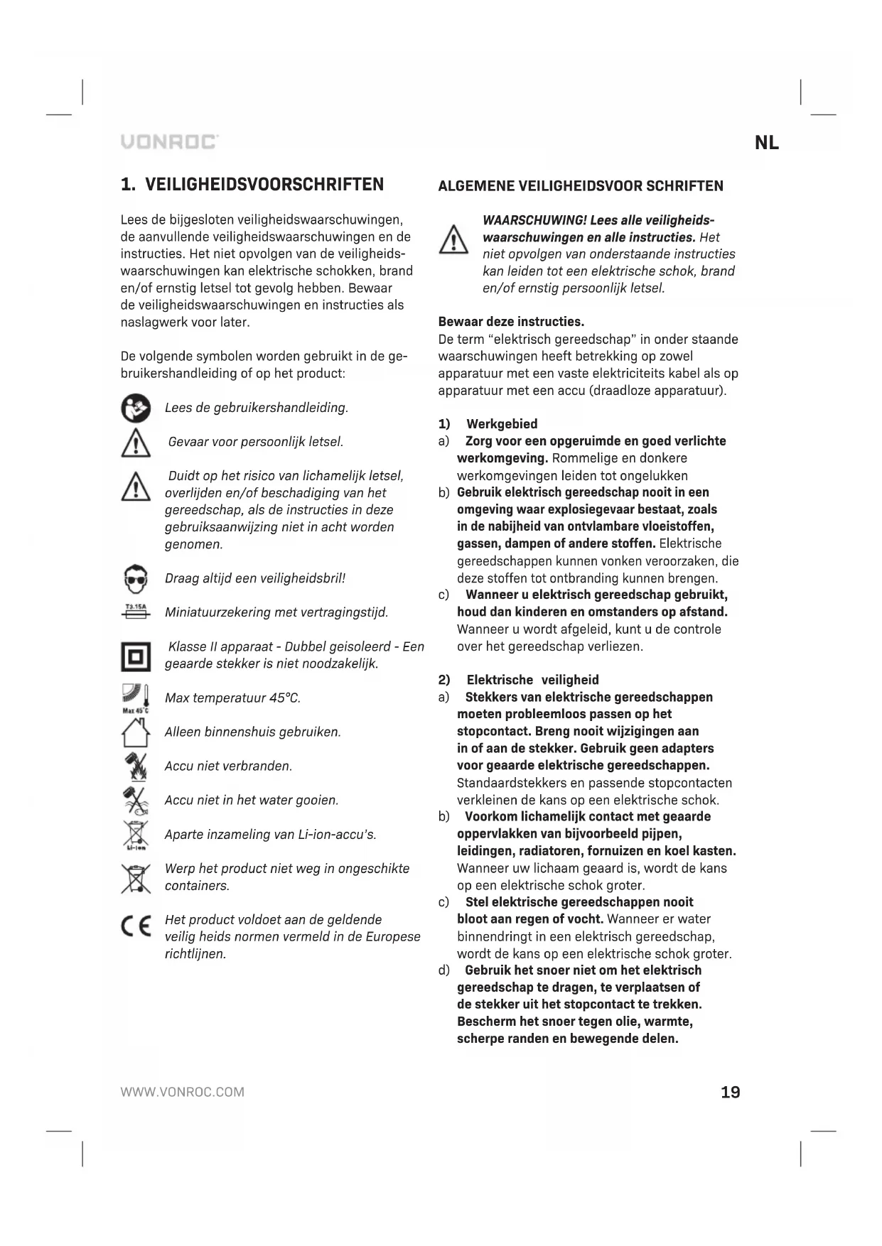 het werkstuk en probeer het opnieuw. Als dat er geen verbetering oplevert, is het gekozen mate- riaal misschien niet geschikt voor het gereed- schap of moet de slagkracht worden aangepast. Schoonmaken Reinig de machinebehuizing regelmatig met een zachte doek, bij voorkeur iedere keer na gebruik. Zorg dat de ventilatiesleuven vrij van stof en vuil zijn. Gebruik bij hardnekkig vuil een zachte doek bevochtigd met zeepwater. Gebruik geen oplosmid- delen als benzine, alcohol, ammonia, etc. Dergelij- ke stoffen beschadigen de kunststof onderdelen. MILIEU Defecte en/of afgedankte elektrische of elektronische gereedschappen dienen ter verwerking te worden aangeboden aan een daarvoor verantwoordelijke instantie. Uitsluitend voor EG-landen Werp elektrisch gereedschap niet weg bij het huis- vuil. Conform de Europese Richtlijn 2012/19/ EG voor Afgedankte Elektrische en Elektronische Apparatuur en de implementatie ervan in nationaal recht moet niet langer te gebruiken elektrisch gereedschap gescheiden worden verzameld en op een milieuvriendelijke wijze worden verwerkt. GARANTIE VONROC producten zijn ontworpen volgens de hoogste kwaliteitsstandaarden en gegarandeerd vrij van defecten, zowel materieel als fabrieksfouten, tijdens de wettelijk vastgestelde garantieperiode vanaf de eerste aankoopdatum. Mocht het product tijdens deze periode gebreken vertonen veroorzaakt door defecte materialen en/of fabrieksfouten, neem dan rechtstreeks contact op met VONROC. De volgende situaties vallen niet onder de garantie: