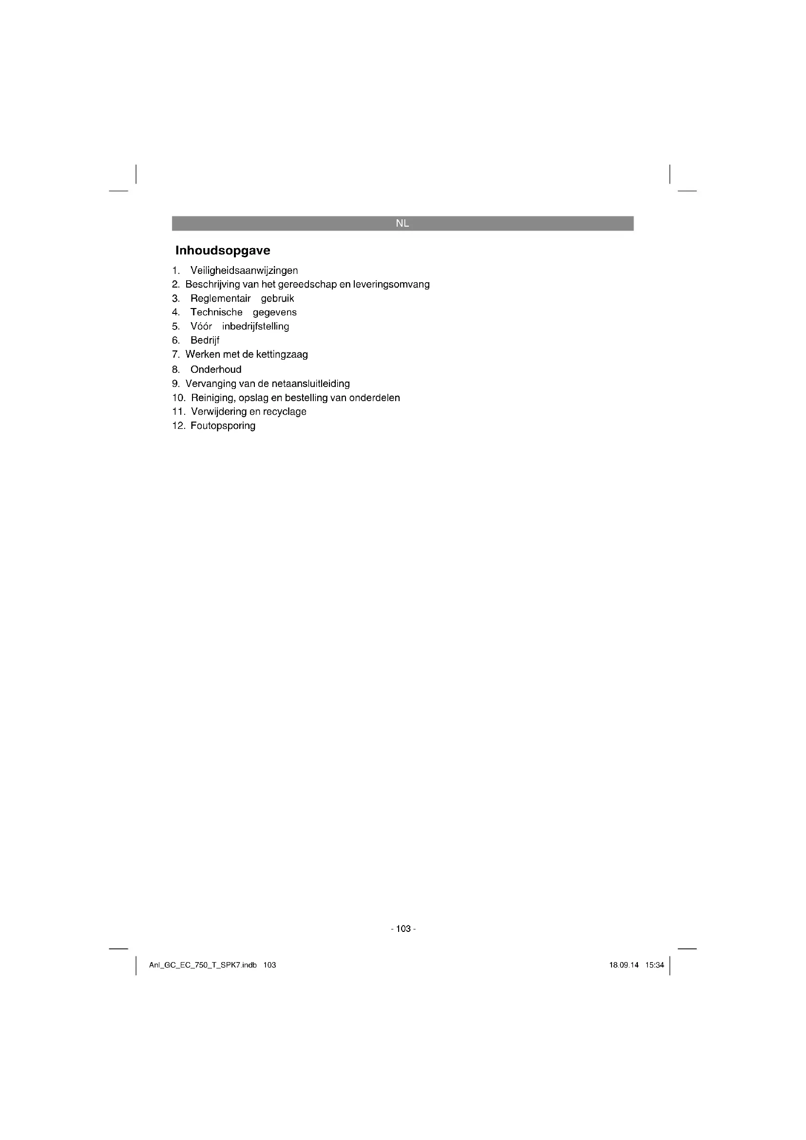 U kan met de kettingzaag enkel eff ectief werken als de zaagketting in goede staat verkeert en scherp is. Daardoor vermindert ook het gevaar voor een terugstoot. De zaagketting kan bij elke gespecialiseerde handelaar worden bijgeslepen. Probeer niet de zaagketting zelf te scherpen als u niet over het gepaste gereedschap en de nodige ervaring beschikt. Anl_GC_EC_750_T_SPK7.indb 109Anl_GC_EC_750_T_SPK7.indb 109 18.09.14 15:3418.09.14 15:34NL