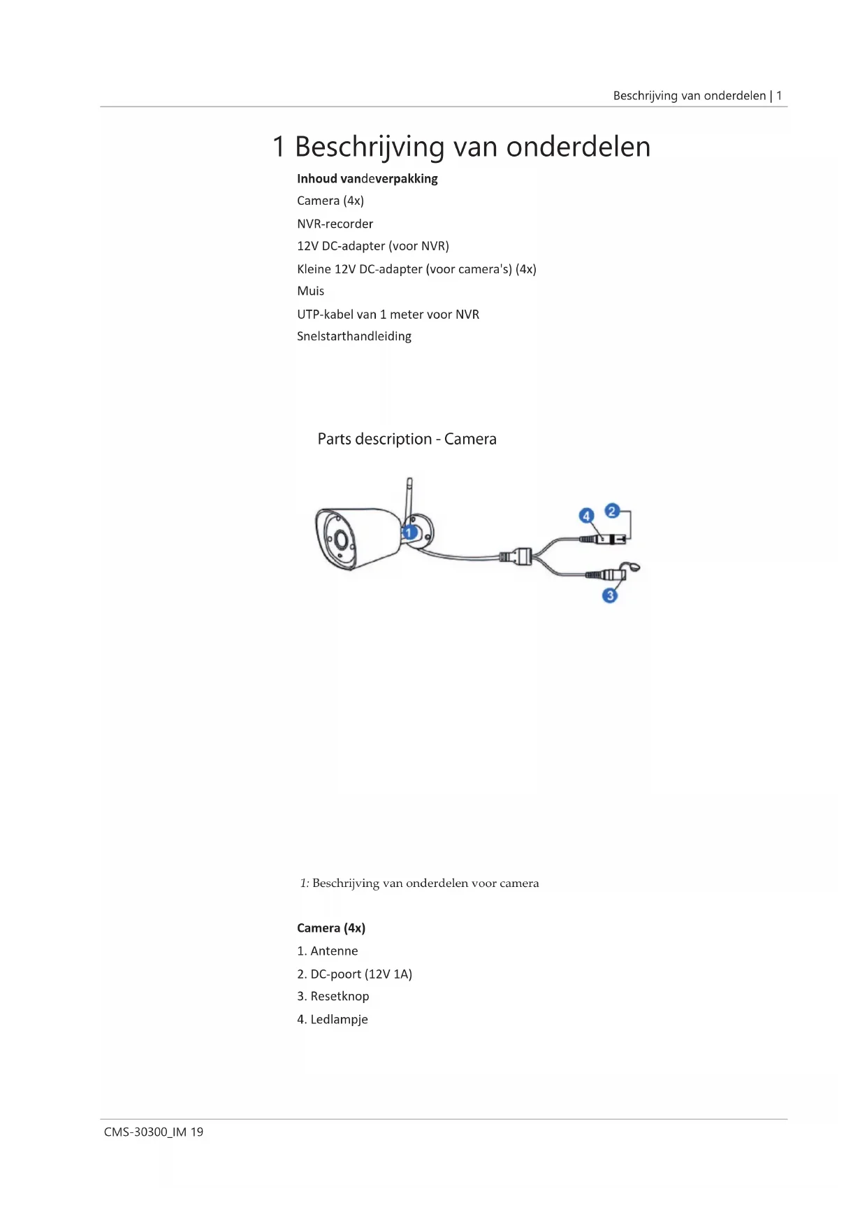 – Op het tabblad Persoonlijk centrum kunt u uw accountgegevens bekijken en wijzi- gen. – Op het configuratiescherm vindt u het volgende: – Accountinformatie Basisinformatie Wachtwoord wijzigen – Instellingen Push-meldingen inschakelen Statistieken voor mobiele gegevens Crash-bestand uploaden – Lijst delen – Help – Privacybeleid – App-versie7 | Conformiteitsverklaring 34 CMS-30300_IM 7 Conformiteitsverklaring Hierbij verklaart, Smartwares Europe dat het type radioapparatuur CMS-30100 con- form is met Richtlijn 2014/53/EU. De volledige tekst van de EU-conformiteitsverklaring kan worden geraadpleegd op het volgende internetadres: www.smartwares.eu/docTeilebeschreibung | 1 CMS-30300_IM 35 1 Teilebeschreibung Lieferumfang Kamera (4x) NVR-Recorder 12-V-DC-Netzteil (für NVR) Kleines 12-V-DC-Netzteil (für Kameras)(4x) Maus 1m UTP-Kabel für NVR Kurzanleitung Parts description - Camera Abb.1: Teilebeschreibung Kamera Kamera (4x)