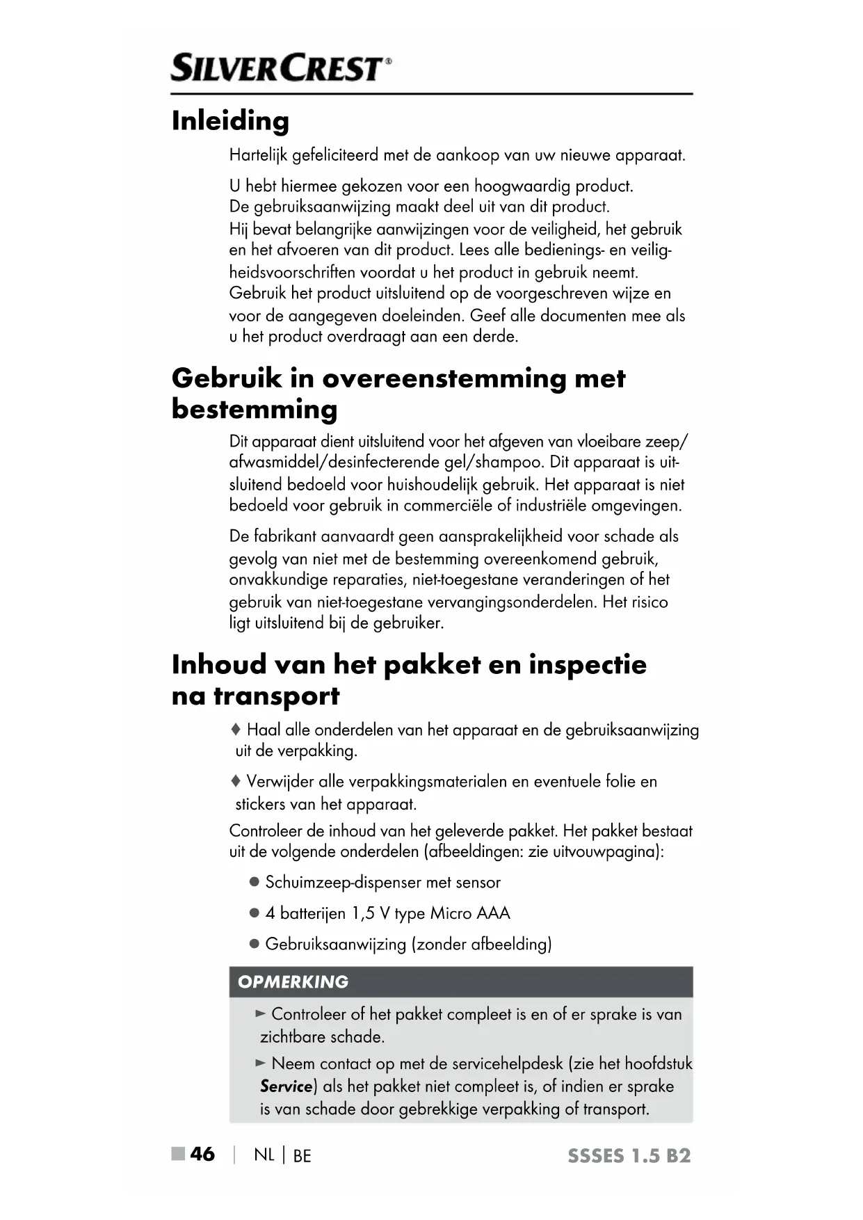 SSSES 1.5 B2 Inleiding Hartelijk gefeliciteerd met de aankoop van uw nieuwe apparaat. U hebt hiermee gekozen voor een hoogwaardig product. De gebruiksaanwijzing maakt deel uit van dit product. Hij bevat belangrijke aanwijzingen voor de veiligheid, het gebruik en het afvoeren van dit product. Lees alle bedienings- en veilig- heidsvoorschriften voordat u het product in gebruik neemt. Gebruik het product uitsluitend op de voorgeschreven wijze en voor de aangegeven doeleinden. Geef alle documenten mee als u het product overdraagt aan een derde. Gebruik in overeenstemming met bestemming Dit apparaat dient uitsluitend voor het afgeven van vloeibare zeep/ afwasmiddel/desinfecterende gel/shampoo. Dit apparaat is uit- sluitend bedoeld voor huishoudelijk gebruik. Het apparaat is niet bedoeld voor gebruik in commerciële of industriële omgevingen. De fabrikant aanvaardt geen aansprakelijkheid voor schade als gevolg van niet met de bestemming overeenkomend gebruik, onvakkundige reparaties, niet-toegestane veranderingen of het gebruik van niet-toegestane vervangingsonderdelen. Het risico ligt uitsluitend bij de gebruiker. Inhoud van het pakket en inspectie na transport ♦ Haal alle onderdelen van het apparaat en de gebruiksaanwijzing uit de verpakking. ♦ Verwijder alle verpakkingsmaterialen en eventuele folie en stickers van het apparaat. Controleer de inhoud van het geleverde pakket. Het pakket bestaat uit de volgende onderdelen (afbeeldingen: zie uitvouwpagina): ▯ Schuimzeep-dispenser met sensor ▯ 4 batterijen 1,5 V type Micro AAA ▯ Gebruiksaanwijzing (zonder afbeelding) OPMERKING ► Controleer of het pakket compleet is en of er sprake is van zichtbare schade. ► Neem contact op met de servicehelpdesk (zie het hoofdstuk Service) als het pakket niet compleet is, of indien er sprake is van schade door gebrekkige verpakking of transport.NL