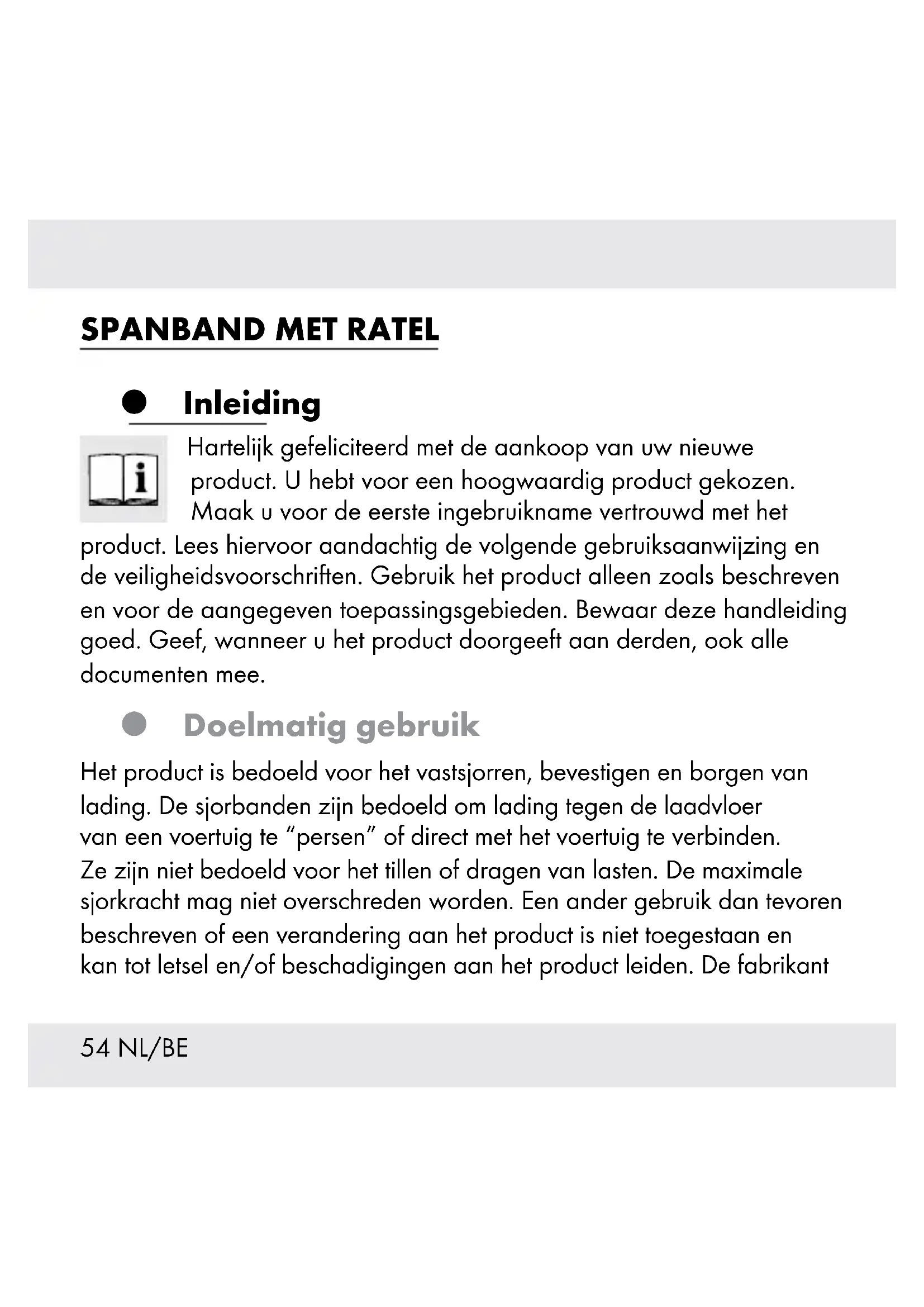 25 daN Materiaal: Polyester (PES) Leveringsomvang Controleer direkt na het uitpakken de omvang van de levering op volledigheid alsook de onberispelijke staat van het product en alle onderdelen.56 NL/BE 1 x spanband met ratel 1 x gebruiksaanwijzing Veiligheidsinstructies