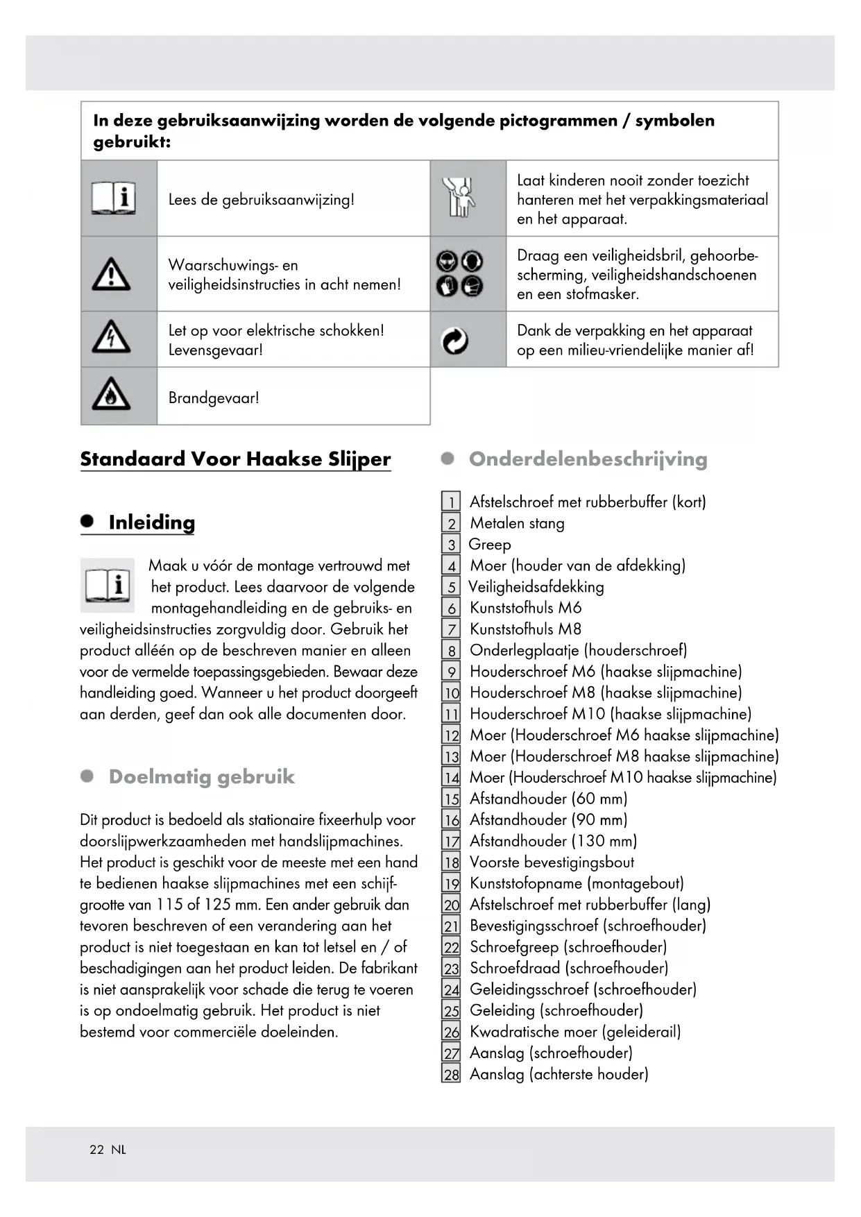 Aanslag (achterste houder) In deze gebruiksaanwijzing worden de volgende pictogrammen / symbolen gebruikt: Lees de gebruiksaanwijzing! Laat kinderen nooit zonder toezicht hanteren met het verpakkingsmateriaal en het apparaat. Waarschuwings- en veiligheidsinstructies in acht nemen! Draag een veiligheidsbril, gehoorbe- scherming, veiligheidshandschoenen en een stofmasker. Let op voor elektrische schokken! Levensgevaar! Dank de verpakking en het apparaat op een milieu-vriendelijke manier af! Brandgevaar!23 NL