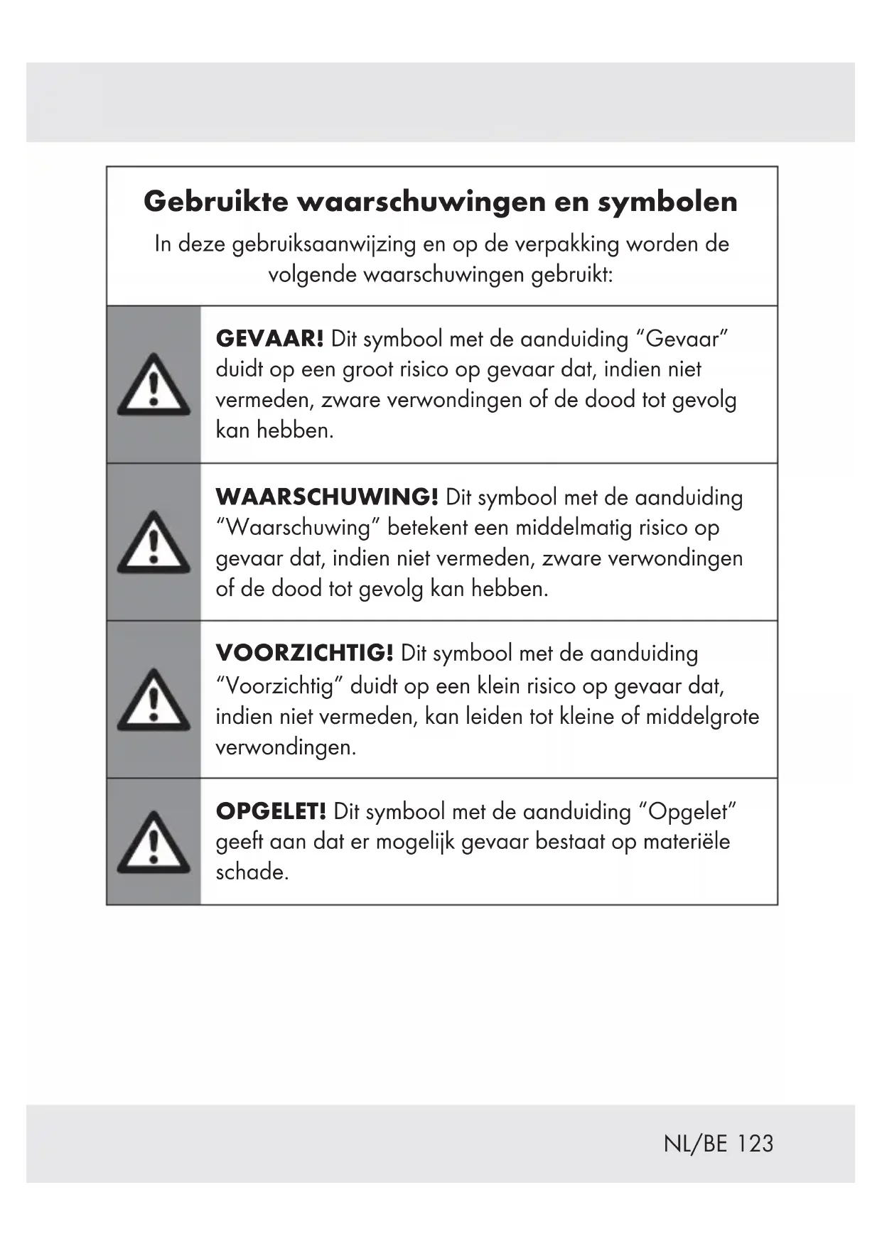 IAN 384680_2107) à titre de preuve d’achat pour toute demande. Le numéro de référence de l’article est indiqué sur la plaque d’identification, gravé sur la page de titre de votre manuel (en bas à gauche) ou sur un autocollant apposé sur la face arrière ou inférieure du produit. En cas de dysfonctionnement du produit, ou de tout autre défaut, contactez en premier lieu le service après-vente par téléphone ou par e-mail aux coordonnées indiquées ci-dessous. Vous pouvez alors envoyer franco de port tout produit considéré comme défectueux au service clientèle indiqué, accompagné de la preuve d’achat (ticket de caisse) et d’une description écrite du défaut avec mention de sa date d’apparition.119 FR/BE z Service après-vente Service après-vente France Tél.: 0800904879 E-Mail: owim@lidl.fr Service après-vente Belgique Tél.: 080071011 Tél.: 80023970 (Luxembourg) E-Mail: owim@lidl.be120 FR/BE z Déclaration de conformité CE121 NL/BE Gebruikte waarschuwingen en symbolen .................................. Pagina 123 Inleiding.................................... Pagina 126 Beoogd gebruik .............................. Pagina 126 Leveringsomvang ............................. Pagina 127 Onderdelenbeschrijving........................ Pagina 128 Technische gegevens .......................... Pagina 129 Veiligheidsaanwijzingen ................ Pagina 133 Algemene veiligheidsaanwijzingen voor elektrische apparaten .................................. Pagina 133 Veiligheidsaanwijzingen voor schroevendraaiers .... Pagina 142 Vermindering van trillingen en geluid.............. Pagina 143 Wat te doen in noodgevallen ................... Pagina 144 Veiligheidsaanwijzingen voor opladers ............ Pagina 144 Overige risico's .............................. Pagina 146 Gebruik .................................... Pagina 147 Informatie over de accu ........................ Pagina 147 Draairichting wijzigen ......................... Pagina 149 LED-werklamp ............................... Pagina 149 Bits en magnetische bithouder verwisselen ......... Pagina 149 Afdekking voorkant ........................... Pagina 150 In-/uitschakelen .............................. Pagina 150122 NL/BE Schoonmaken en onderhoud ........... Pagina 151 Onderhoud ................................. Pagina 152 Opbergen.................................. Pagina 152 Transport .................................. Pagina 153 Afvoer...................................... Pagina 154 Garantie ................................... Pagina 155 Afwikkeling in geval van garantie ................ Pagina 156 Service..................................... Pagina 157 EG-verklaring van overeenstemming. . Pagina 158123 NL/BE Gebruikte waarschuwingen en symbolen In deze gebruiksaanwijzing en op de verpakking worden de volgende waarschuwingen gebruikt: GEVAAR! Dit symbool met de aanduiding “Gevaar” duidt op een groot risico op gevaar dat, indien niet vermeden, zware verwondingen of de dood tot gevolg kan hebben. WAARSCHUWING! Dit symbool met de aanduiding “Waarschuwing” betekent een middelmatig risico op gevaar dat, indien niet vermeden, zware verwondingen of de dood tot gevolg kan hebben. VOORZICHTIG! Dit symbool met de aanduiding “Voorzichtig” duidt op een klein risico op gevaar dat, indien niet vermeden, kan leiden tot kleine of middelgrote verwondingen. OPGELET! Dit symbool met de aanduiding “Opgelet” geeft aan dat er mogelijk gevaar bestaat op materiële schade.124 NL/BE TIP: Dit symbool met de aanduiding “Tip” duidt op verdere nuttige informatie. Gevaar voor elektrische schokken! Wisselstroom/-spanning Gelijkstroom/-spanning BeschermingsklasseII Alleen in droge binnenruimtes gebruiken. Lees de gebruiksaanwijzing.125 NL/BE Li-Ion Lithium-ion accu
