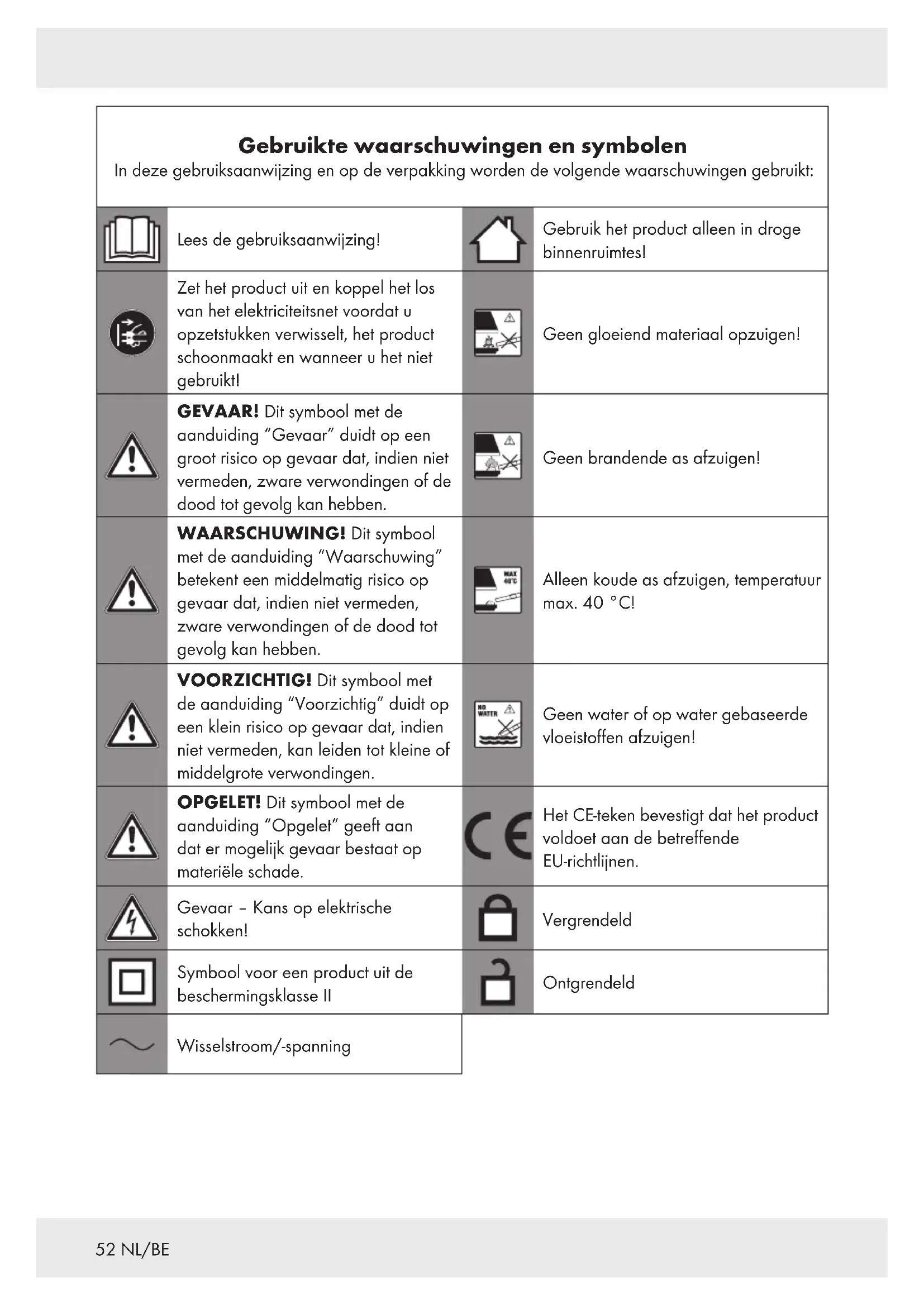 WAARSCHUWING! u “Koude as” is as die voor voldoende lange tijd is afgekoeld en die geen gloeiende resten meer bevat. Dit kan worden vastgesteld door de as met metalen gereedschap om te woelen voor het product gebruikt wordt. Koude as verspreidt geen waarneembare warmtestraling. Het product is niet geschikt voor het afzuigen van onderstaande materialen: Vloeistoffen Roet en sintels Cement-. gips- en kalkstof Brandbare, explosieve of materialen die een gevaar voor de gezondheid vormen Verwarmingsketels en oliekachels