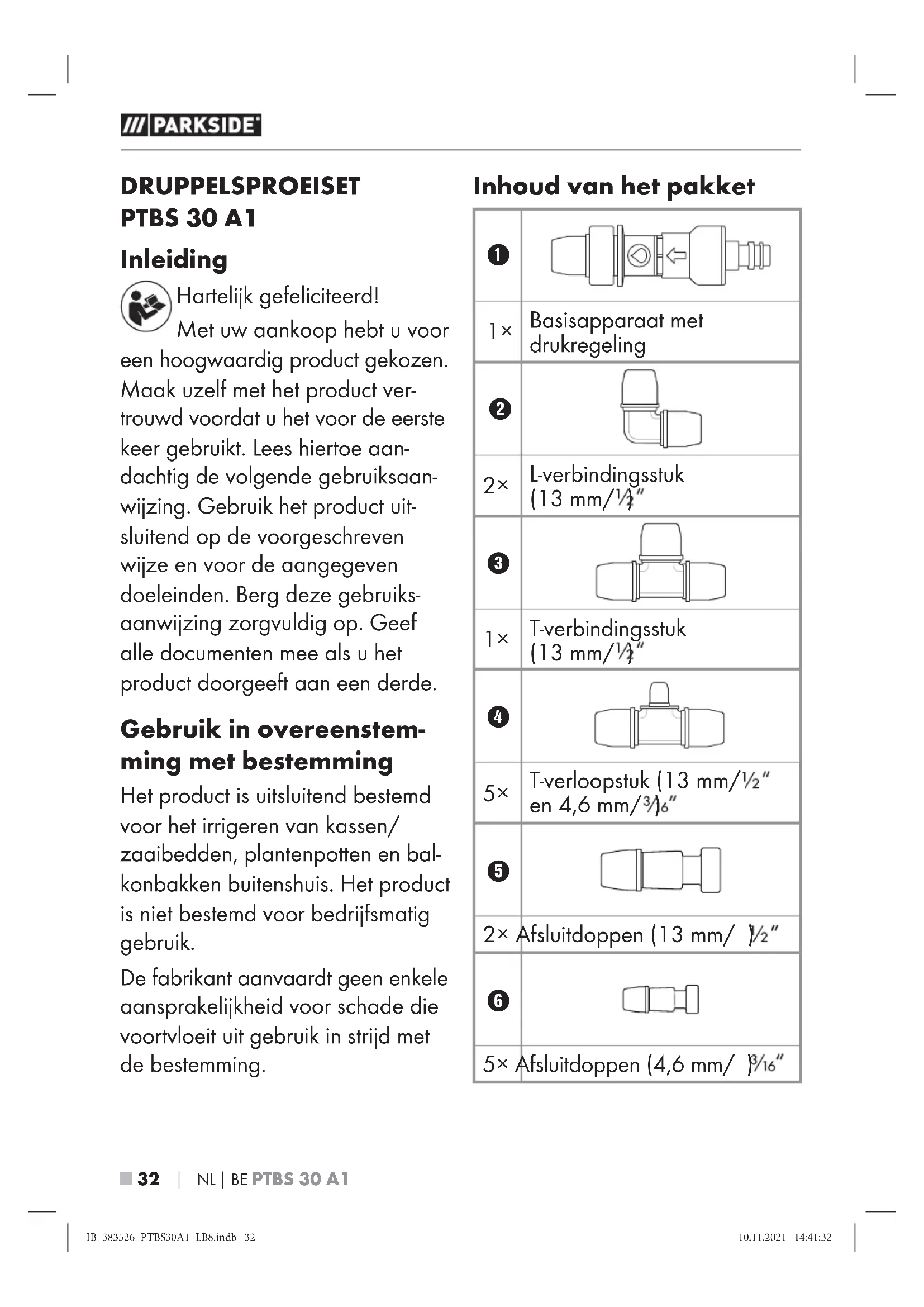 DRUPPELSPROEISET PTBS 30 A1 Inleiding Hartelijk gefeliciteerd! Met uw aankoop hebt u voor een hoogwaardig product gekozen. Maak uzelf met het product ver- trouwd voordat u het voor de eerste keer gebruikt. Lees hiertoe aan- dachtig de volgende gebruiksaan- wijzing. Gebruik het product uit- sluitend op de voorgeschreven wijze en voor de aangegeven doeleinden. Berg deze gebruiks- aanwijzing zorgvuldig op. Geef alle documenten mee als u het product doorgeeft aan een derde. Gebruik in overeenstem- ming met bestemming Het product is uitsluitend bestemd voor het irrigeren van kassen/ zaaibedden, plantenpotten en bal- konbakken buitenshuis. Het product is niet bestemd voor bedrijfsmatig gebruik. De fabrikant aanvaardt geen enkele aansprakelijkheid voor schade die voortvloeit uit gebruik in strijd met de bestemming. Inhoud van het pakket