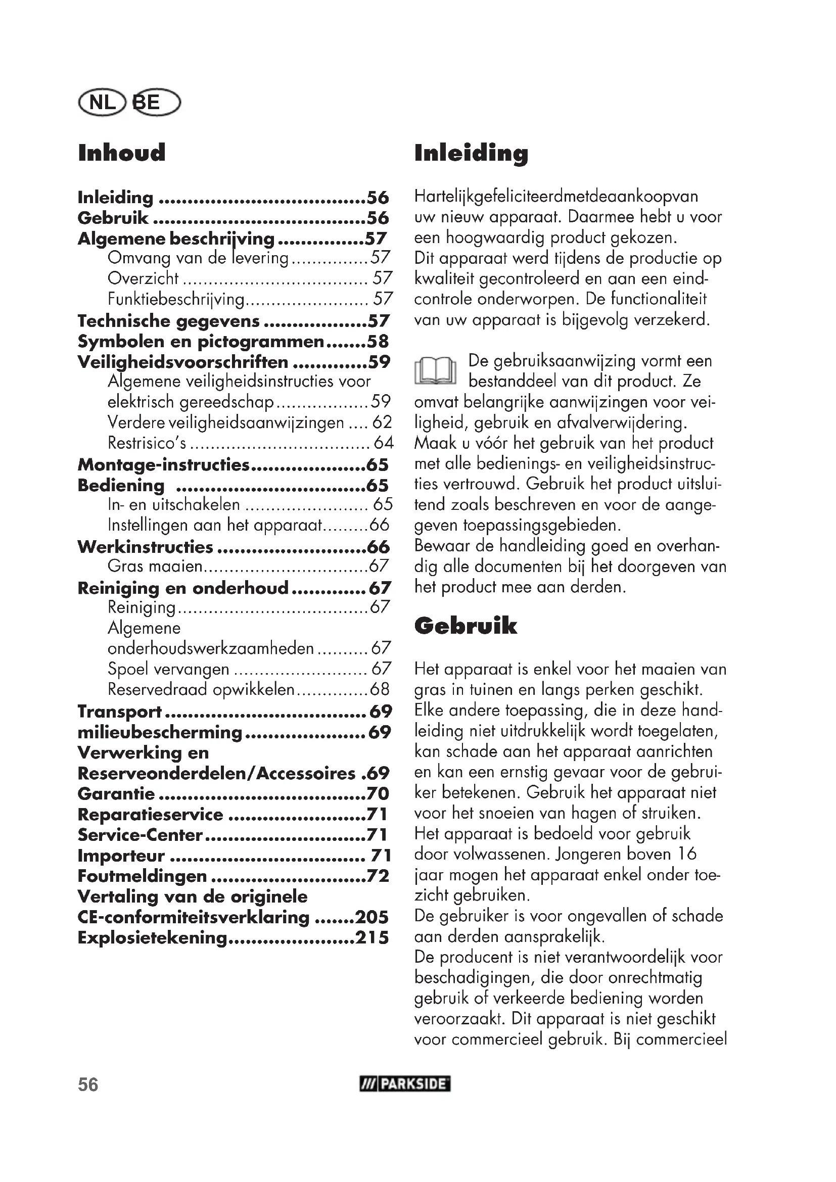 - Explosietekening Inleiding Hartelk gefeliciteerd met de aankoop van uw nieuw apparaat. Daarmee hebt u voor een hoogwaardig product gekozen. Dit apparaat werd tdens de productie op kwaliteit gecontroleerd en aan een eind- controle onderworpen. De functionaliteit van uw apparaat is bgevolg verzekerd. De gebruiksaanwzing vormt een bestanddeel van dit product. Ze omvat belangrke aanwzingen voor vei- ligheid, gebruik en afvalverwdering. Maak u vóór het gebruik van het product met alle bedienings- en veiligheidsinstruc- ties vertrouwd. Gebruik het product uitslui- tend zoals beschreven en voor de aange- geven toepassingsgebieden. Bewaar de handleiding goed en overhan- dig alle documenten b het doorgeven van het product mee aan derden. Gebruik Het apparaat is enkel voor het maaien van gras in tuinen en langs perken geschikt. Elke andere toepassing, die in deze hand- leiding niet uitdrukkelk wordt toegelaten, kan schade aan het apparaat aanrichten en kan een ernstig gevaar voor de gebrui- ker betekenen. Gebruik het apparaat niet voor het snoeien van hagen of struiken. Het apparaat is bedoeld voor gebruik door volwassenen. Jongeren boven 16 jaar mogen het apparaat enkel onder toe- zicht gebruiken. De gebruiker is voor ongevallen of schade aan derden aansprakelk. De producent is niet verantwoordelk voor beschadigingen, die door onrechtmatig gebruik of verkeerde bediening worden veroorzaakt. Dit apparaat is niet geschikt voor commercieel gebruik. B commercieelBENL p. 215