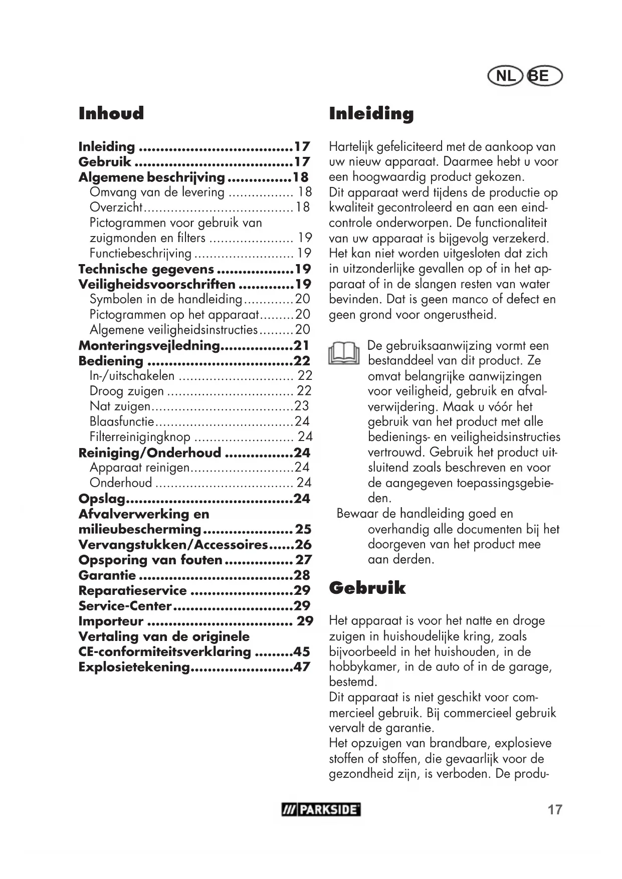- Inleiding Hartelk gefeliciteerd met de aankoop van uw nieuw apparaat. Daarmee hebt u voor een hoogwaardig product gekozen. Dit apparaat werd tdens de productie op kwaliteit gecontroleerd en aan een eind- controle onderworpen. De functionaliteit van uw apparaat is bgevolg verzekerd. Het kan niet worden uitgesloten dat zich in uitzonderlke gevallen op of in het ap- paraat of in de slangen resten van water bevinden. Dat is geen manco of defect en geen grond voor ongerustheid. De gebruiksaanwzing vormt een bestanddeel van dit product. Ze omvat belangrke aanwzingen voor veiligheid, gebruik en afval- verwdering. Maak u vóór het gebruik van het product met alle bedienings- en veiligheidsinstructies vertrouwd. Gebruik het product uit- sluitend zoals beschreven en voor de aangegeven toepassingsgebie- den. Bewaar de handleiding goed en overhandig alle documenten b het doorgeven van het product mee aan derden. Gebruik Het apparaat is voor het natte en droge zuigen in huishoudelke kring, zoals bvoorbeeld in het huishouden, in de hobbykamer, in de auto of in de garage, bestemd. Dit apparaat is niet geschikt voor com- mercieel gebruik. B commercieel gebruik vervalt de garantie. Het opzuigen van brandbare, explosieve stoffen of stoffen, die gevaarlk voor de gezondheid zn, is verboden. De produ- Vertaling van de originele CE-conformiteitsverklaring p. 45