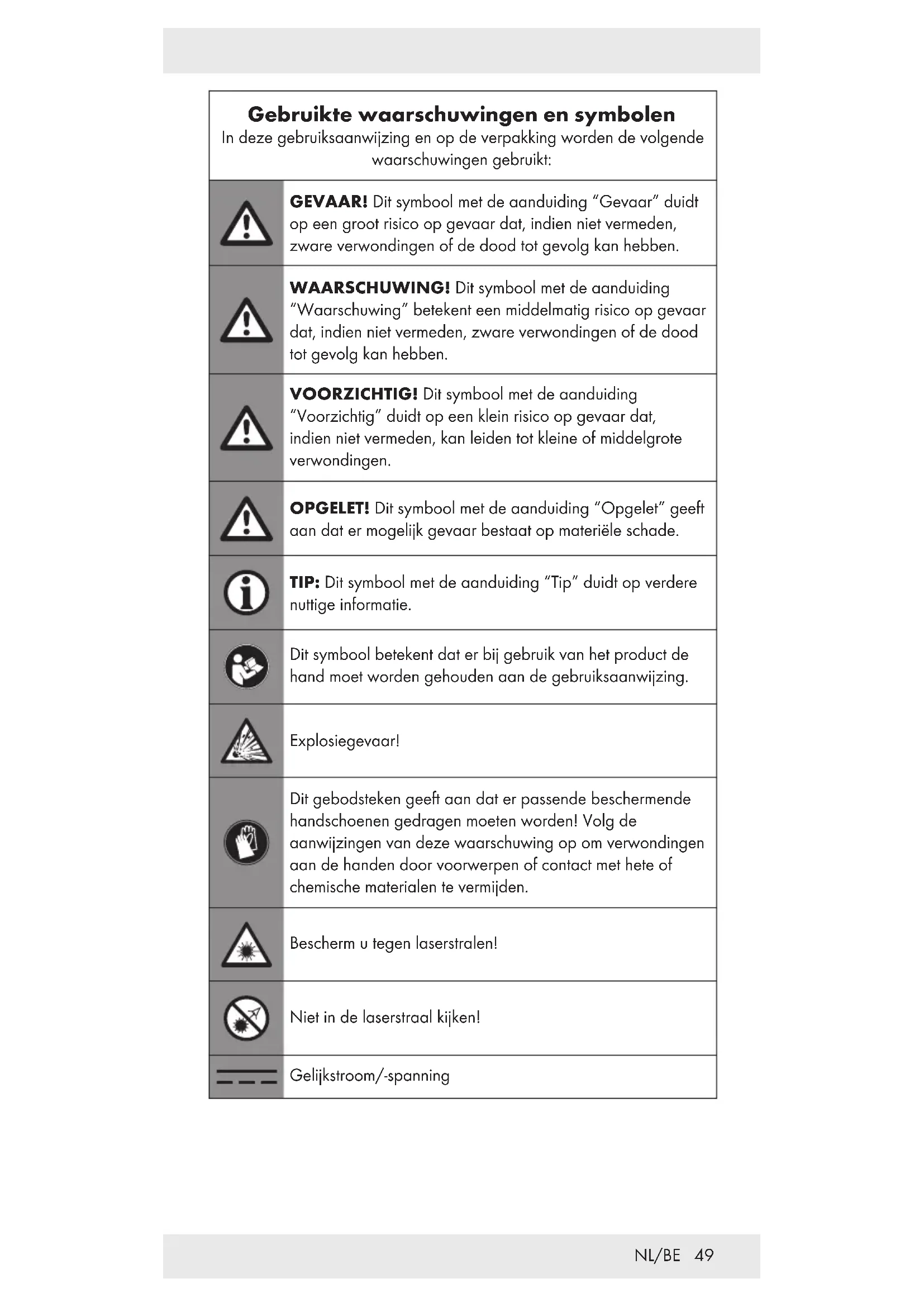 PEUTERS EN KINDEREN! Laat kinderen nooit zonder toezicht achter met het verpakkingsmateriaal. Het verpakkingsmateriaal vormt een verstikkingsgevaar. Kinderen onderschatten vaak de daaraan verbonden gevaren. Houd kinderen altijd uit de buurt van verpakkingsmateriaal. Het product mag alleen door volwassenen worden gebruikt. Kinderen jonger dan 16jaar mogen het product alleen gebruiken als ze onder toezicht staan. Houd kinderen steeds uit de buurt van het product.53 NL/BE Algemene instructies Houd de hand aan de specificaties in deze gebruiksaanwijzing aangaande bediening, schoonmaken, opslag en verwijdering. Controleer het product voor ieder gebruik. Laat een beschadigd product repareren. Gebruik het product nooit als het is beschadigd. Schakel het product uit als het niet gebruikt wordt. Laat het product nooit zonder toezicht. Houd het product uit de buurt van medische apparatuur, magnetische gegevensdragers en apparaten die gevoelig zijn voor magnetische velden. Werken met een laser