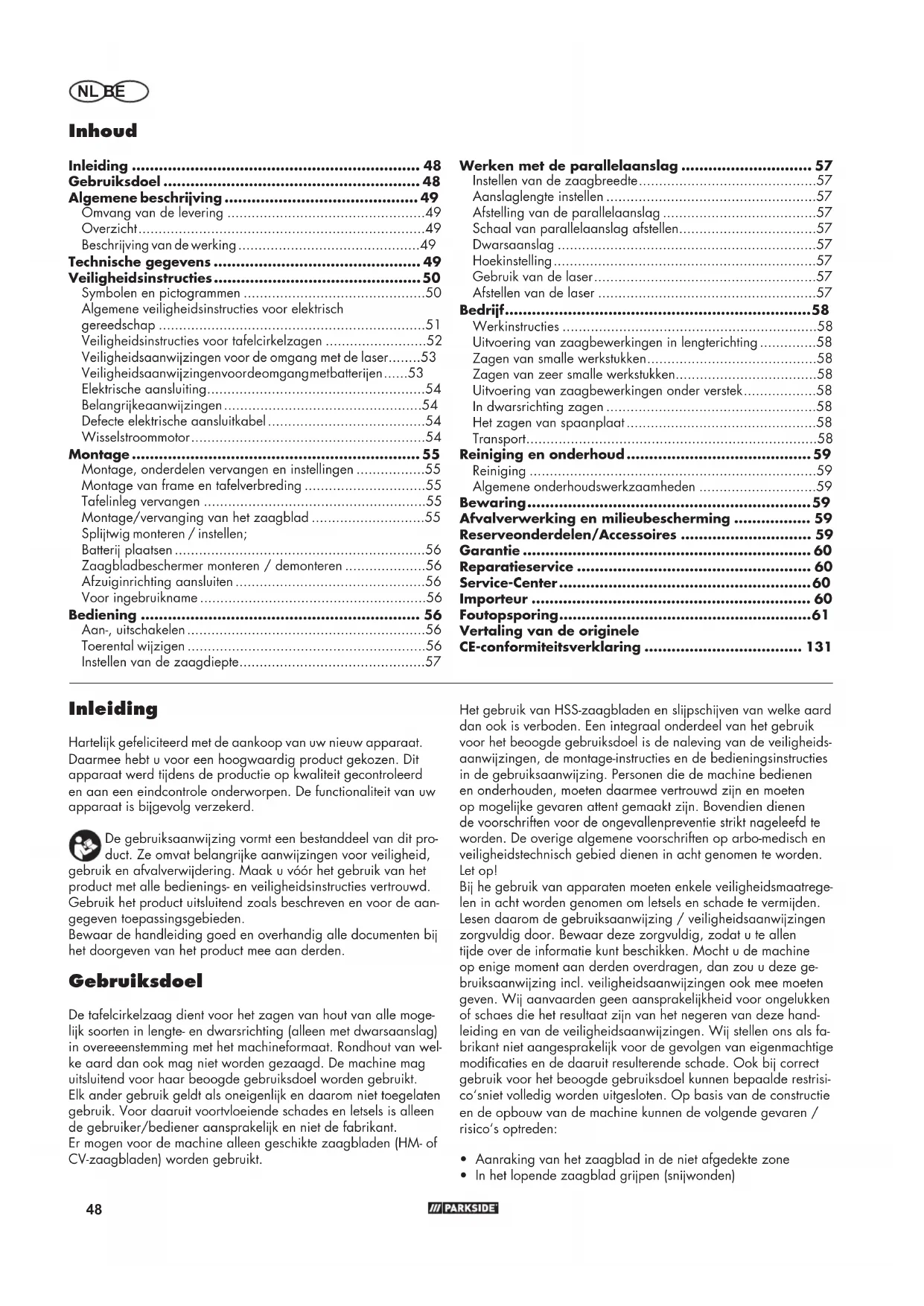 - Vertaling van de originele CE-conformiteitsverklaring Inleiding Hartelk gefeliciteerd met de aankoop van uw nieuw apparaat. Daarmee hebt u voor een hoogwaardig product gekozen. Dit apparaat werd tdens de productie op kwaliteit gecontroleerd en aan een eindcontrole onderworpen. De functionaliteit van uw apparaat is bgevolg verzekerd. De gebruiksaanwzing vormt een bestanddeel van dit pro- duct. Ze omvat belangrke aanwzingen voor veiligheid, gebruik en afvalverwdering. Maak u vóór het gebruik van het product met alle bedienings- en veiligheidsinstructies vertrouwd. Gebruik het product uitsluitend zoals beschreven en voor de aan- gegeven toepassingsgebieden. Bewaar de handleiding goed en overhandig alle documenten b het doorgeven van het product mee aan derden. Gebruiksdoel De tafelcirkelzaag dient voor het zagen van hout van alle moge- lk soorten in lengte- en dwarsrichting (alleen met dwarsaanslag) in overeeenstemming met het machineformaat. Rondhout van wel- ke aard dan ook mag niet worden gezaagd. De machine mag uitsluitend voor haar beoogde gebruiksdoel worden gebruikt. Elk ander gebruik geldt als oneigenlk en daarom niet toegelaten gebruik. Voor daaruit voortvloeiende schades en letsels is alleen de gebruiker/bediener aansprakelk en niet de fabrikant. Er mogen voor de machine alleen geschikte zaagbladen (HM- of CV-zaagbladen) worden gebruikt. Het gebruik van HSS-zaagbladen en slpschven van welke aard dan ook is verboden. Een integraal onderdeel van het gebruik voor het beoogde gebruiksdoel is de naleving van de veiligheids- aanwzingen, de montage-instructies en de bedieningsinstructies in de gebruiksaanwzing. Personen die de machine bedienen en onderhouden, moeten daarmee vertrouwd zn en moeten op mogelke gevaren attent gemaakt zn. Bovendien dienen de voorschriften voor de ongevallenpreventie strikt nageleefd te worden. De overige algemene voorschriften op arbo-medisch en veiligheidstechnisch gebied dienen in acht genomen te worden. Let op! B he gebruik van apparaten moeten enkele veiligheidsmaatrege- len in acht worden genomen om letsels en schade te vermden. Lesen daarom de gebruiksaanwzing / veiligheidsaanwzingen zorgvuldig door. Bewaar deze zorgvuldig, zodat u te allen tde over de informatie kunt beschikken. Mocht u de machine op enige moment aan derden overdragen, dan zou u deze ge- bruiksaanwzing incl. veiligheidsaanwzingen ook mee moeten geven. W aanvaarden geen aansprakelkheid voor ongelukken of schaes die het resultaat zn van het negeren van deze hand- leiding en van de veiligheidsaanwzingen. W stellen ons als fa- brikant niet aangesprakelk voor de gevolgen van eigenmachtige modicaties en de daaruit resulterende schade. Ook b correct gebruik voor het beoogde gebruiksdoel kunnen bepaalde restrisi- co‘sniet volledig worden uitgesloten. Op basis van de constructie en de opbouw van de machine kunnen de volgende gevaren / risico‘s optreden: p. 131