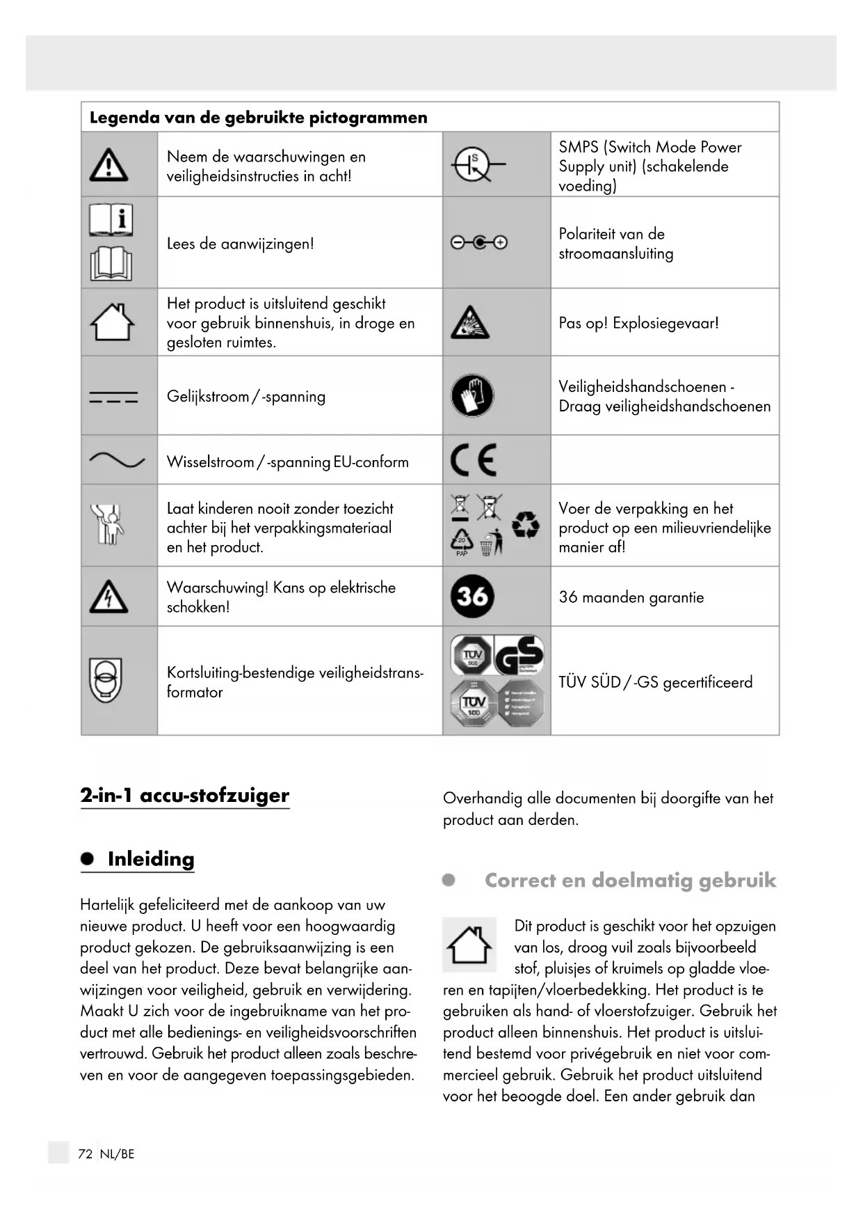 PAP Voer de verpakking en het product op een milieuvriendelijke manier af! Waarschuwing! Kans op elektrische schokken! 36 maanden garantie Kortsluiting-bestendige veiligheidstrans- formator TÜV SÜD / -GS gecertificeerd 2-in-1 accu-stofzuiger Inleiding Hartelijk gefeliciteerd met de aankoop van uw nieuwe product. U heeft voor een hoogwaardig product gekozen. De gebruiksaanwijzing is een deel van het product. Deze bevat belangrijke aan- wijzingen voor veiligheid, gebruik en verwijdering. Maakt U zich voor de ingebruikname van het pro- duct met alle bedienings- en veiligheidsvoorschriften vertrouwd. Gebruik het product alleen zoals beschre- ven en voor de aangegeven toepassingsgebieden. Overhandig alle documenten bij doorgifte van het product aan derden. Correct en doelmatig gebruik Dit product is geschikt voor het opzuigen van los, droog vuil zoals bijvoorbeeld stof, pluisjes of kruimels op gladde vloe- ren en tapijten/vloerbedekking. Het product is te gebruiken als hand- of vloerstofzuiger. Gebruik het product alleen binnenshuis. Het product is uitslui- tend bestemd voor privégebruik en niet voor com- mercieel gebruik. Gebruik het product uitsluitend voor het beoogde doel. Een ander gebruik dan73 NL/BE eerder beschreven of een verandering aan het product is niet toegestaan en kan tot letsel en / of beschadigingen leiden. De fabrikant is niet aan- sprakelijk voor schade die terug te voeren is op ondoelmatig gebruik. Beschrijving van de onderdelen
