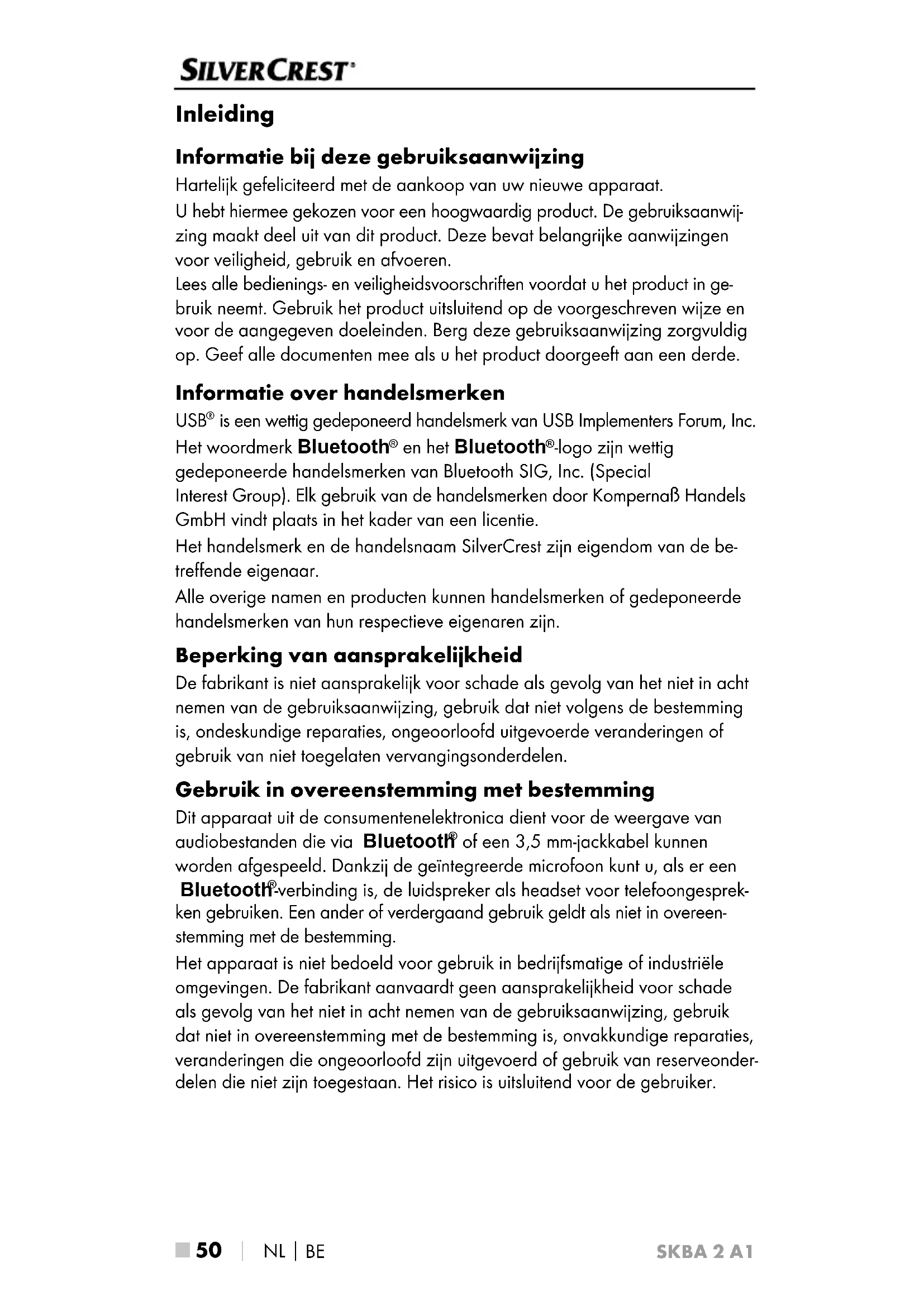 -verbinding is, de luidspreker als headset voor telefoongesprek- ken gebruiken. Een ander of verdergaand gebruik geldt als niet in overeen- stemming met de bestemming. Het apparaat is niet bedoeld voor gebruik in bedrijfsmatige of industriële omgevingen. De fabrikant aanvaardt geen aansprakelijkheid voor schade als gevolg van het niet in acht nemen van de gebruiksaanwijzing, gebruik dat niet in overeenstemming met de bestemming is, onvakkundige reparaties, veranderingen die ongeoorloofd zijn uitgevoerd of gebruik van reserveonder- delen die niet zijn toegestaan. Het risico is uitsluitend voor de gebruiker.SKBA 2 A1