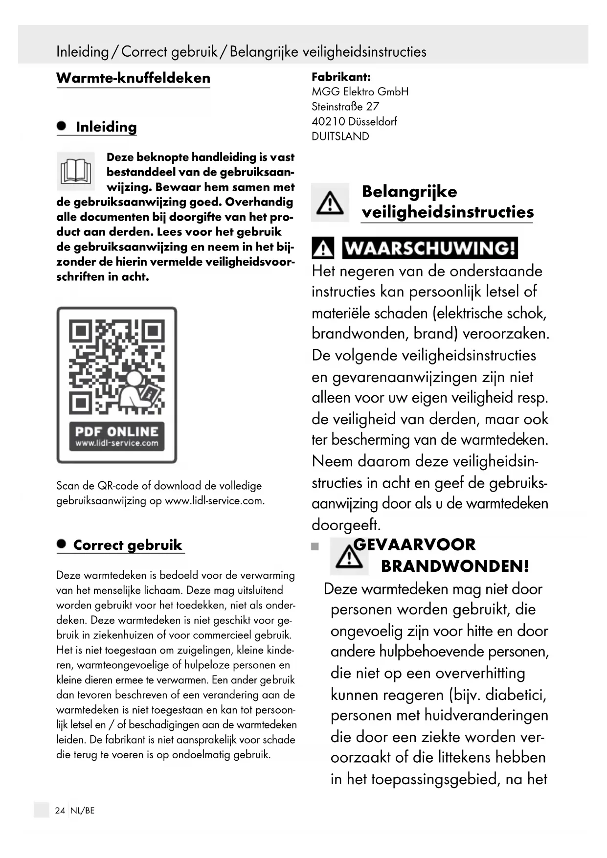 de la couverture chauffante. Rangement RISQUE DE DÉGÂTS MATÉRIELS ! Laissez la couverture chauffante refroi- dir avant de la plier et de la ranger. Sinon, la couverture chauffante risque d‘être endommagée. RISQUE DE DÉGÂTS MATÉRIELS ! Ne poser pas d‘objets sur la couver- ture chauffante rangée pour éviter les faux plis. Sinon, la couverture chauffante risque d‘être endommagée.23 NL/BE Inhoudsopgave Inleiding ....................................................................................................................................... Pagina 24 Correct gebruik ...................................................................................................................... Pagina 24 Belangrijke veiligheidsinstructies .......................................................................... Pagina 24 Veiligheidssysteem ............................................................................................................. Pagina 27 Ingebruikname ...................................................................................................................... Pagina 27 In- / uitschakelen / temperatuur selecteren ..................................................................................... Pagina 27 Temperatuurstanden ....................................................................................................................... Pagina 27 Automatische uitschakeling ............................................................................................................ Pagina 27 Bewaren ...................................................................................................................................... Pagina 2824 NL/BE Inleiding / Correct gebruik / Belangrijke veiligheidsinstructies Warmte-knuffeldeken Inleiding Deze beknopte handleiding is v ast bestanddeel van de gebruiksaan- wijzing. Bewaar hem samen met de gebruiksaanwijzing goed. Overhandig alle documenten bij doorgifte van het pro- duct aan derden. Lees voor het gebruik de gebruiksaanwijzing en neem in het bij- zonder de hierin vermelde veiligheidsvoor- schriften in acht. Scan de QR-code of download de volledige gebruiksaanwijzing op www.lidl-service.com. Correct gebruik Deze warmtedeken is bedoeld voor de verwarming van het menselijke lichaam. Deze mag uitsluitend worden gebruikt voor het toedekken, niet als onder- deken. Deze warmtedeken is niet geschikt voor ge- bruik in ziekenhuizen of voor commercieel gebruik. Het is niet toegestaan om zuigelingen, kleine kinde- ren, warmteongevoelige of hulpeloze personen en kleine dieren ermee te verwarmen. Een ander ge bruik dan tevoren beschreven of een verandering aan de warmtedeken is niet toegestaan en kan tot persoon- lijk letsel en / of beschadigingen aan de warmtedeken leiden. De fabrikant is niet aansprakelijk voor schade die terug te voeren is op ondoelmatig gebruik. Fabrikant: MGG Elektro GmbH Steinstraße 27 40210 Düsseldorf DUITSLAND Belangrijke veiligheidsinstructies Het negeren van de onderstaande instructies kan persoonlijk letsel of materiële schaden (elektrische schok, brandwonden, brand) veroorzaken. De volgende veiligheidsinstructies en gevarenaanwijzingen zijn niet alleen voor uw eigen veiligheid resp. de veiligheid van derden, maar ook ter bescherming van de warmtede ken. Neem daarom deze veiligheidsin- structies in acht en geef de gebruiks- aanwijzing door als u de warmtedek