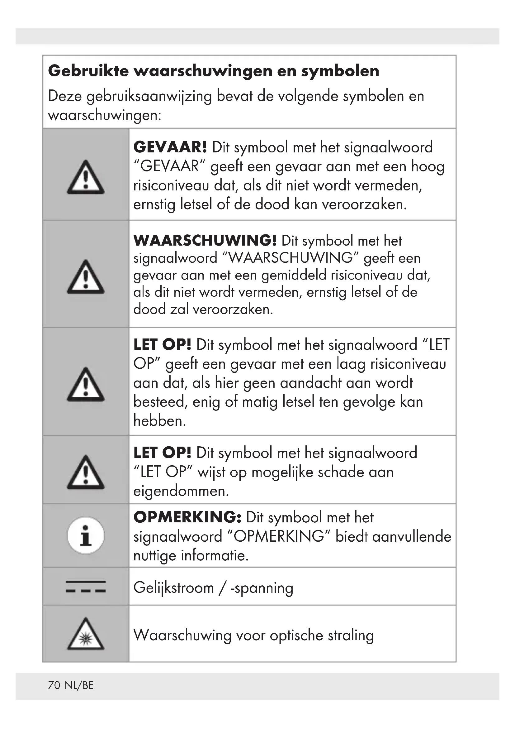 VOOR ONGELUKKEN VOOR KINDEREN! GEVAAR! VERSTIKKINGSGEVAAR! Laat kinderen nooit zonder toezicht achter met het verpakkingsmateriaal. Het verpakkingsmateriaal vormt een verstikkingsrisico. Kinderen onderschatten deze gevaren. Het verpakkingsmateriaal is geen speelgoed. Dit product mag worden gebruikt door kinderen van 8 jaar of ouder en door personen met beperkte fysieke of geestelijke capaciteiten of zonder ervaring en/of kennis, zolang ze onder toezicht staan of instructie krijgen in het veilige gebruik van het product en de bijbehorende risico‘s begrijpen. Laat kinderen niet spelen met het product. Onderhoud en reiniging mogen niet door kinderen worden uitgevoerd zonder toezicht. Het product is geen speelgoed. GEVAAR! Een aantal van de geleverde onderdelen kan worden ingeslikt. Neem direct contact op met een arts als per ongeluk een onderdeel is ingeslikt. WAARSCHUWING! Radiostoringen Schakel het product uit in vliegtuigen, ziekenhuizen, onderhoudsruimten, of in de nabijheid van medische elektronische systemen. De overgebrachte draadloze signalen kunnen de werking van gevoelige elektronica beïnvloeden. Houd het product ten minste 20 cm uit de buurt van pacemakers of implanteerbare cardioverter-defilibratoren, omdat de elektromagnetische straling de werking van pacemakers kan beïnvloeden.75 NL/BE De afgegeven radiogolven kunnen interferentie veroorzaken in gehoorapparaten. Plaats het product niet in de buurt van brandbare gassen of mogelijk explosieve gebieden (zoals schilderwerkplaatsen) met de draadloze componenten ingeschakeld, omdat de afgegeven radiogolven explosies en brand kunnen veroorzaken. Het bereik van de radiogolven is afhankelijk van de omgeving. In het geval van draadloze gegevensoverdracht kan niet worden uitgesloten dat ongeautoriseerde derden de gegevens ontvangen. Veiligheidsinstructies voor batterijen LEVENSGEVAAR! Houd batterijen buiten het bereik van kinderen. Neem direct contact op met een arts als ze per ongeluk zijn ingeslikt. Inslikken kan leiden tot inwendige verbrandingen, perforatie van zacht weefsel en tot de dood. Ernstige inwendige verbrandingen kunnen binnen 2 uur na het inslikken optreden. WAARSCHUWING!! EXPLOSIEGEVAAR! Probeer nooit gewone batterijen te herladen. Kortsluit batterijen niet en/of open ze niet. Dit kan leiden tot oververhitting, brand of openscheuren. Gooi batterijen nooit in vuur of water. Oefen geen mechanische belasting uit op batterijen.76 NL/BE Risico van lekken van batterijen Voorkom extreme omstandigheden in de omgeving en temperaturen die invloed kunnen hebben op batterijen, zoals radiatoren en rechtstreeks zonlicht. Verwijder lekkende batterijen direct uit het product om schade te voorkomen. Vermijd contact van lekkende chemicaliën met de huid, ogen en slijmvliezen. In geval van contact met accuzuur het aangetaste gebied grondig spoelen met voldoende schoon water en roep onmiddellijk medische hulp in. DRAAG BESCHERMENDE HANDSCHOENEN! Lekkende of beschadigde batterijen kunnen brandwonden veroorzaken bij contact met de huid. Draag altijd geschikte beschermende handschoenen als een dergelijk geval optreedt. Beide batterijen moeten altijd op hetzelfde moment te worden vervangen. Plaats batterijen volgens de polariteitstekens (+) en (-) op de batterij en het product. Probeer nooit om batterijen te laden en werp ze onder geen enkele omstandigheid in het vuur. Maak de contacten van de batterijen en in het batterijvak schoon voordat u deze plaatst. Verwijder lege batterijen onmiddellijk uit het product. Gebruik uitsluitend het opgegeven type batterij! Verwijder de batterij als het product voor langere tijd niet gebruikt zal worden. Onjuist gebruik kan explosies en levensgevaar veroorzaken.77 NL/BE