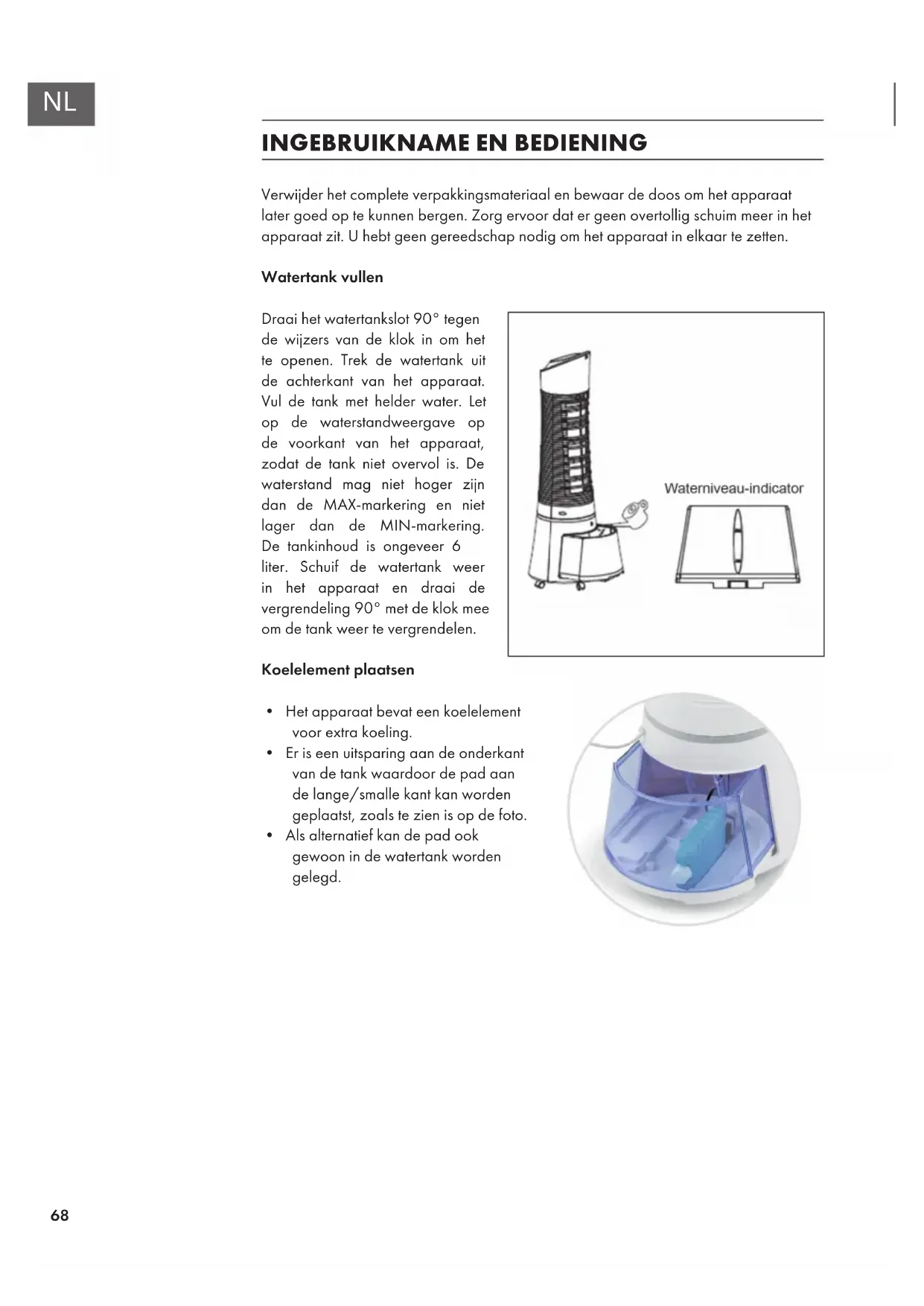 Verwijder het complete verpakkingsmateriaal en bewaar de doos om het apparaat later goed op te kunnen bergen. Zorg ervoor dat er geen overtollig schuim meer in het apparaat zit. U hebt geen gereedschap nodig om het apparaat in elkaar te zetten. Watertank vullen Draai het watertankslot 90° tegen de wijzers van de klok in om het te openen. Trek de watertank uit de achterkant van het apparaat. Vul de tank met helder water. Let op de waterstandweergave op de voorkant van het apparaat, zodat de tank niet overvol is. De waterstand mag niet hoger zijn dan de MAX-markering en niet lager dan de MIN-markering. De tankinhoud is ongeveer 6 liter. Schuif de watertank weer in het apparaat en draai de vergrendeling 90° met de klok mee om de tank weer te vergrendelen. Koelelement plaatsen
