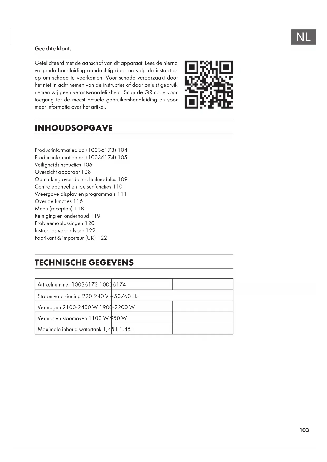Geachte klant, Gefeliciteerd met de aanschaf van dit apparaat. Lees de hierna volgende handleiding aandachtig door en volg de instructies op om schade te voorkomen. Voor schade veroorzaakt door het niet in acht nemen van de instructies of door onjuist gebruik nemen wij geen verantwoordelijkheid. Scan de QR code voor toegang tot de meest actuele gebruikershandleiding en voor meer informatie over het artikel. INHOUDSOPGAVE TECHNISCHE GEGEVENS Artikelnummer 10036173 10036174 Stroomvoorziening 220-240 V ~ 50/60 Hz Vermogen 2100-2400 W 1900-2200 W Vermogen stoomoven 1100 W 950 W Maximale inhoud watertank 1,45 L 1,45 L Productinformatieblad (10036173)104 Productinformatieblad (10036174)105 Veiligheidsinstructies106 Overzicht apparaat108 Opmerking over de inschuifmodules109 Controlepaneel en toetsenfuncties110 Weergave display en programma’s111 Overige functies116 Menu (recepten)118 Reiniging en onderhoud119 Probleemoplossingen120 Instructies voor afvoer122 Fabrikant & importeur (UK)122104