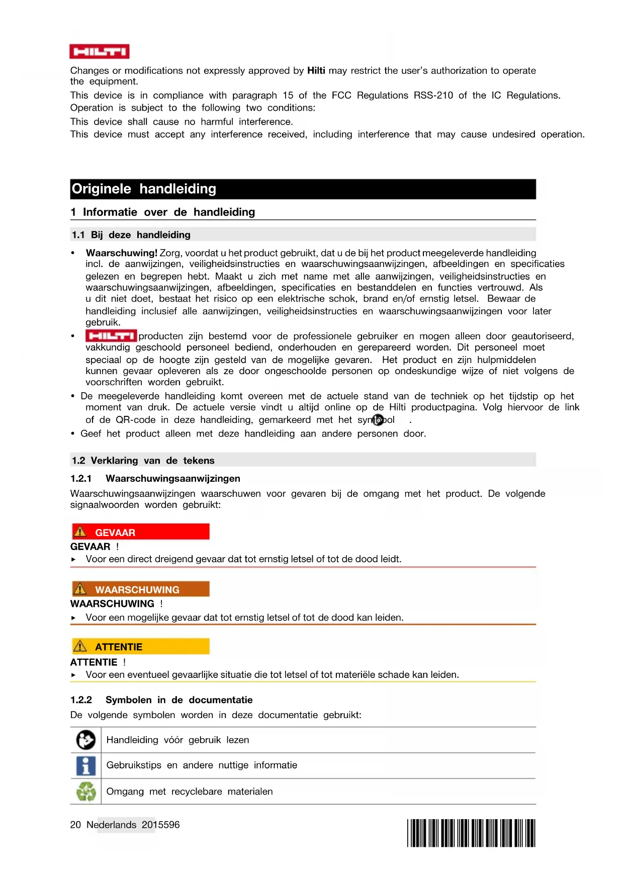 - De meegeleverde handleiding komt overeen met de actuele stand van de techniek op het tijdstip op het moment van druk. De actuele versie vindt u altijd online op de Hilti productpagina. Volg hiervoor de link of de QR-code in deze handleiding, gemarkeerd met het symbool .