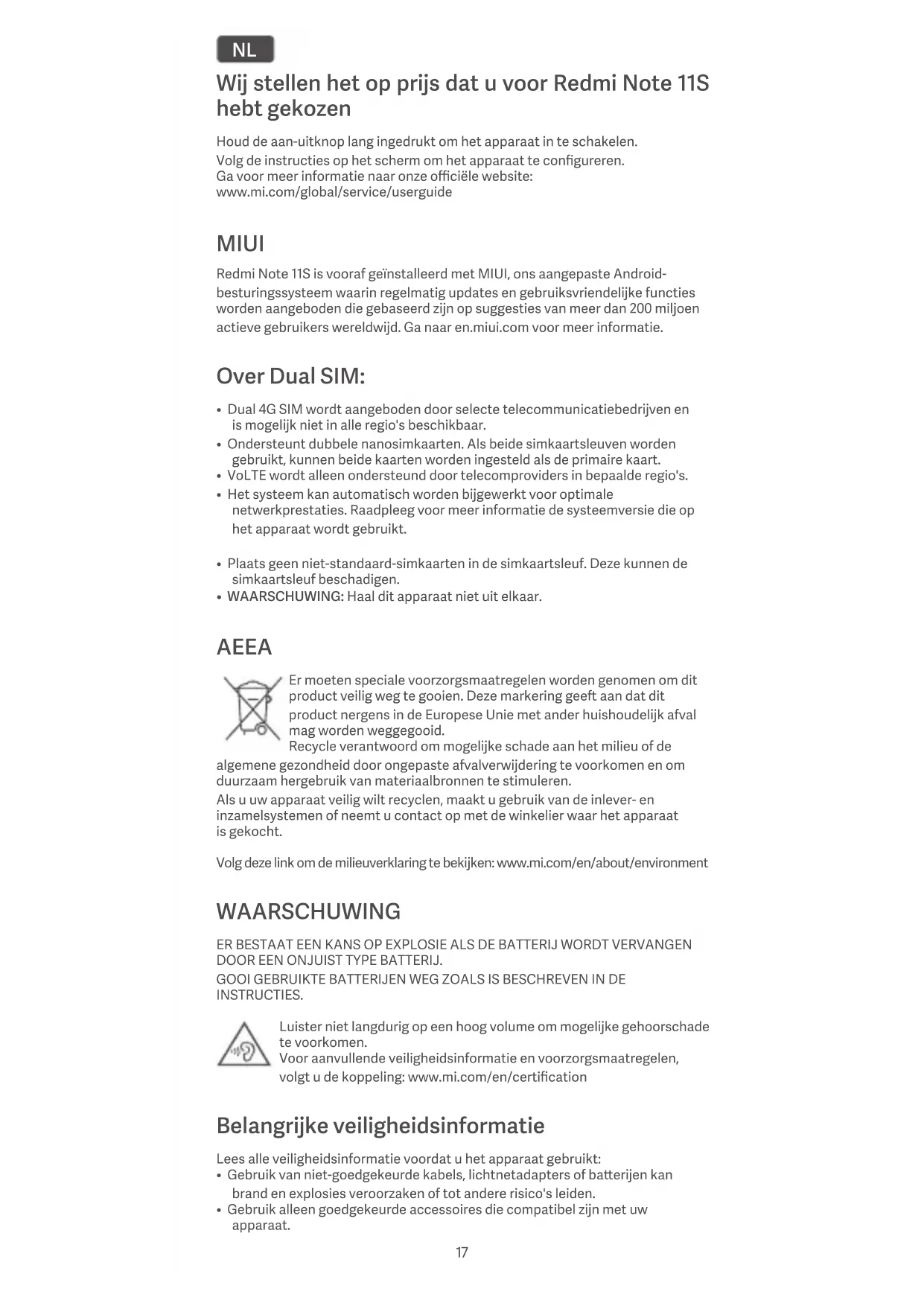 - WAARSCHUWING: Haal dit apparaat niet uit elkaar. AEEA Er moeten speciale voorzorgsmaatregelen worden genomen om dit product veilig weg te gooien. Deze markering gee aan dat dit product nergens in de Europese Unie met ander huishoudelijk afval mag worden weggegooid. Recycle verantwoord om mogelijke schade aan het milieu of de algemene gezondheid door ongepaste afvalverwijdering te voorkomen en om duurzaam hergebruik van materiaalbronnen te stimuleren. Als u uw apparaat veilig wilt recyclen, maakt u gebruik van de inlever- en inzamelsystemen of neemt u contact op met de winkelier waar het apparaat is gekocht. Volg deze link om de milieuverklaring te bekijken: www.mi.com/en/about/environment WAARSCHUWING ER BESTAAT EEN KANS OP EXPLOSIE ALS DE BATTERIJ WORDT VERVANGEN DOOR EEN ONJUIST TYPE BATTERIJ. GOOI GEBRUIKTE BATTERIJEN WEG ZOALS IS BESCHREVEN IN DE INSTRUCTIES. Luister niet langdurig op een hoog volume om mogelijke gehoorschade te voorkomen. Voor aanvullende veiligheidsinformatie en voorzorgsmaatregelen, volgt u de koppeling: www.mi.com/en/certification Belangrijke veiligheidsinformatie Lees alle veiligheidsinformatie voordat u het apparaat gebruikt: