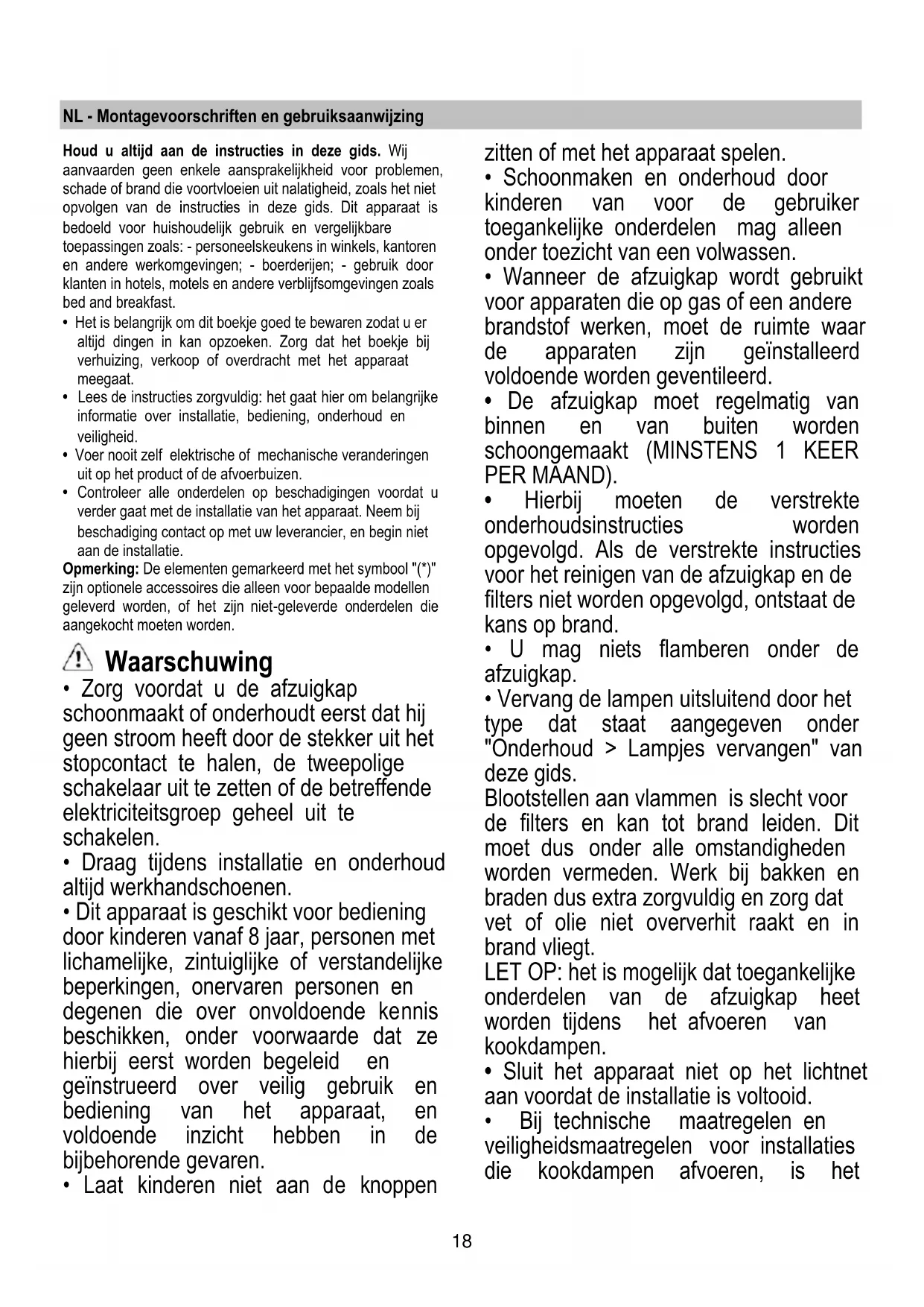 - Hierbij moeten de verstrekte onderhoudsinstructies worden opgevolgd. Als de verstrekte instructies voor het reinigen van de afzuigkap en de filters niet worden opgevolgd, ontstaat de kans op brand.