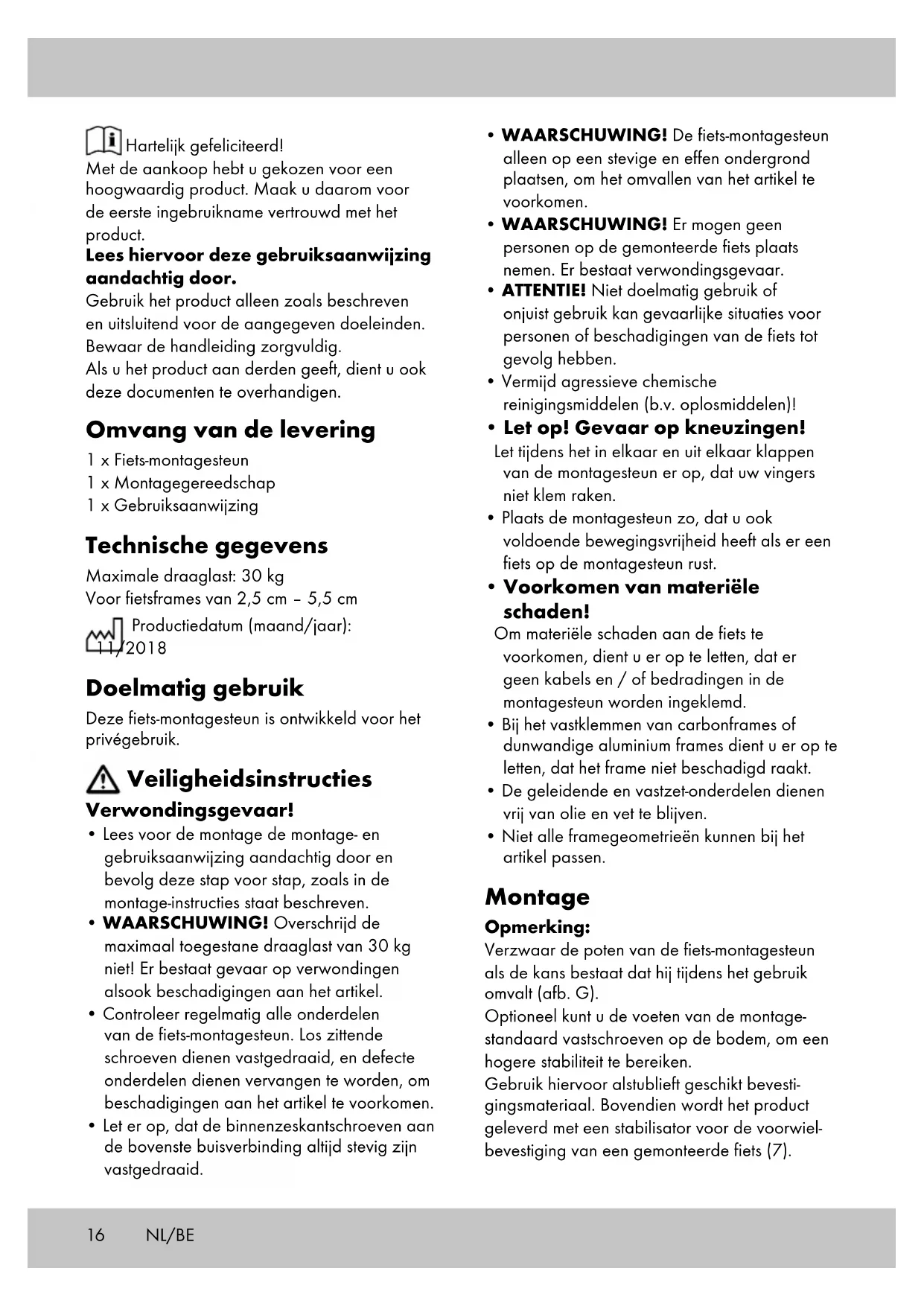 - WAARSCHUWING! De fiets-montagesteun alleen op een stevige en effen ondergrond plaatsen, om het omvallen van het artikel te voorkomen.