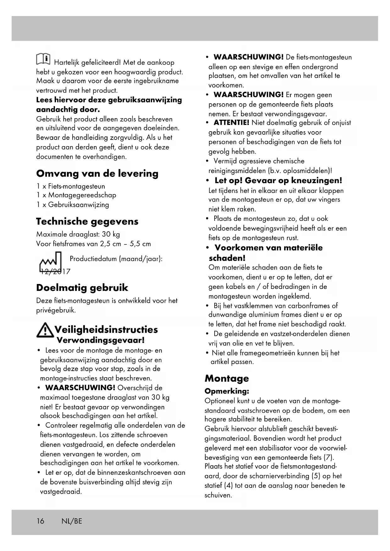 - Let op! Gevaar op kneuzingen! Let tijdens het in elkaar en uit elkaar klappen van de montagesteun er op, dat uw vingers niet klem raken.