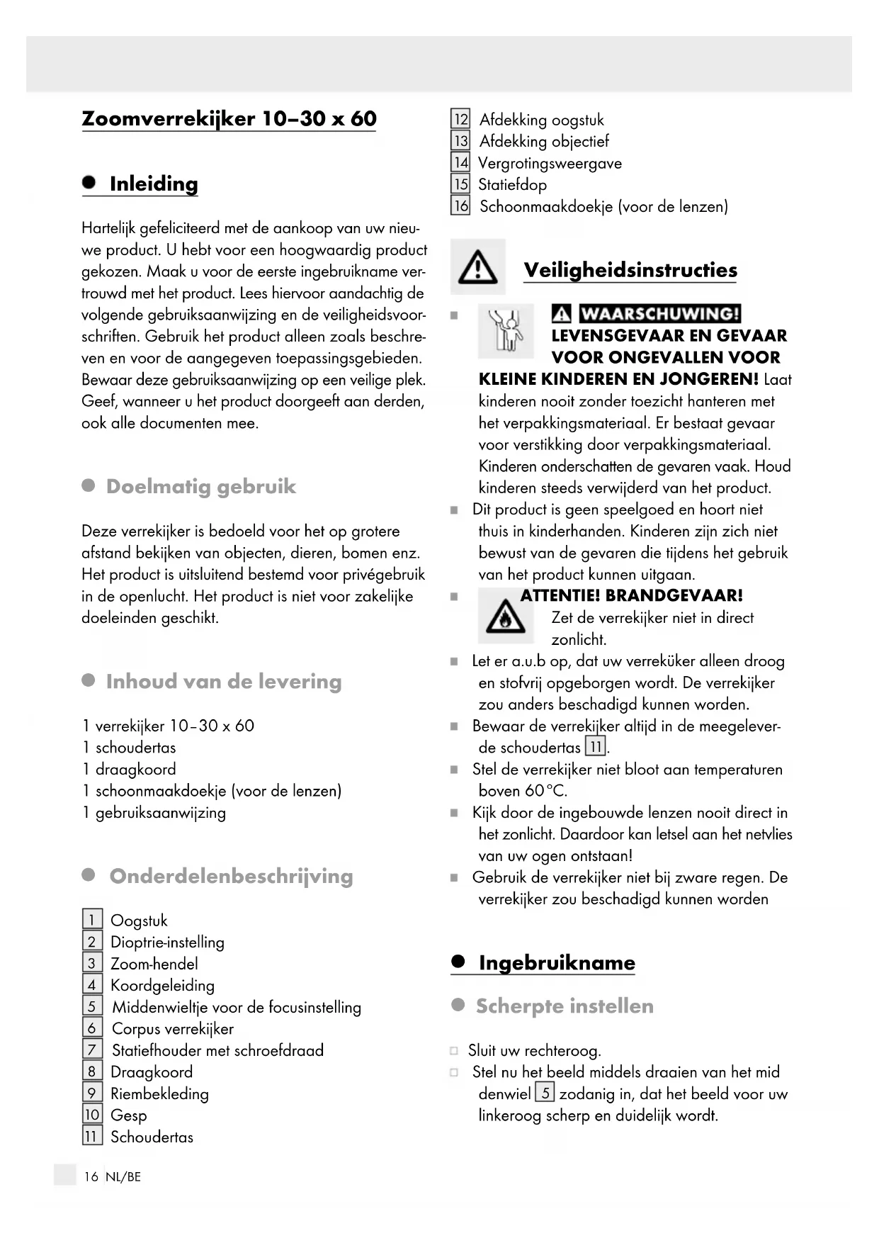 KLEINE KINDEREN EN JONGEREN! Laat kinderen nooit zonder toezicht hanteren met het verpakkingsmateriaal. Er bestaat gevaar voor verstikking door verpakkingsmateriaal. Kinderen onderschatten de gevaren vaak. Houd kinderen steeds verwijderd van het product. Dit product is geen speelgoed en hoort niet thuis in kinderhanden. Kinderen zijn zich niet bewust van de gevaren die tijdens het gebruik van het product kunnen uitgaan. ATTENTIE! BRANDGEVAAR! Zet de verrekijker niet in direct zonlicht. Let er a.u.b op, dat uw verreküker alleen droog en stofvrij opgeborgen wordt. De verrekijker zou anders beschadigd kunnen worden. Bewaar de verrekijker altijd in de meegelever- de schoudertas