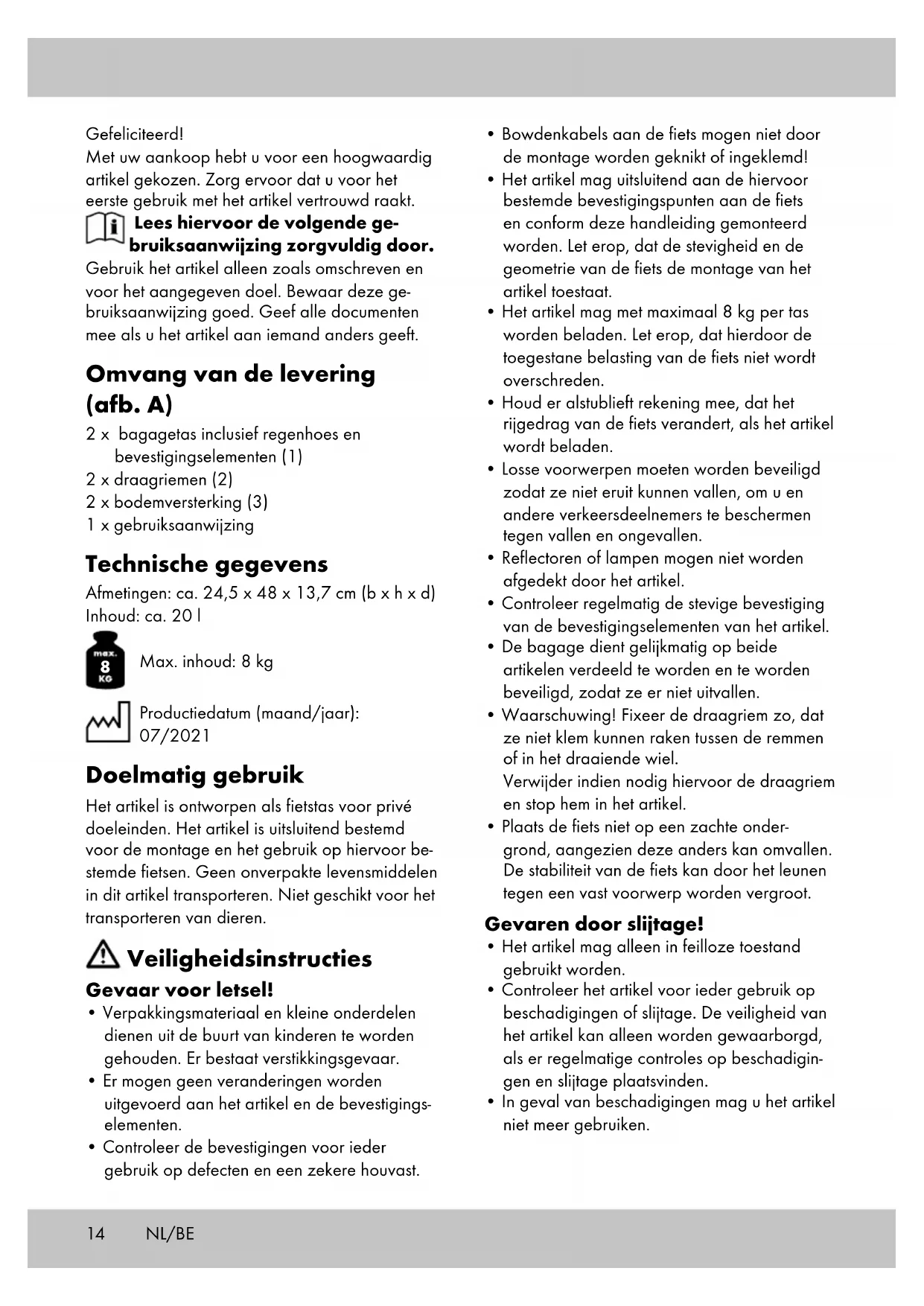 Max. inhoud: 8 kg Productiedatum (maand/jaar): 07/2021 Doelmatig gebruik Het artikel is ontworpen als fietstas voor privé doeleinden. Het artikel is uitsluitend bestemd voor de montage en het gebruik op hiervoor be- stemde fietsen. Geen onverpakte levensmiddelen in dit artikel transporteren. Niet geschikt voor het transporteren van dieren. Veiligheidsinstructies Gevaar voor letsel!
