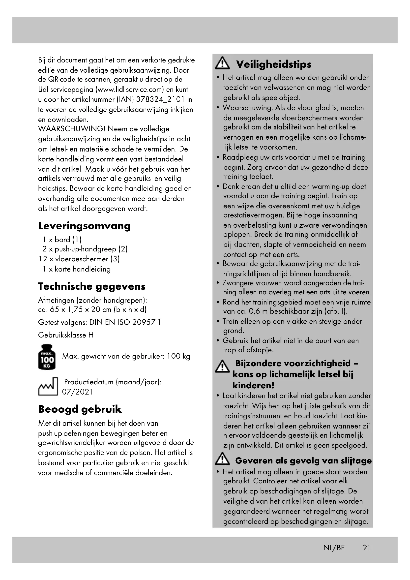 Stockage, nettoyage Lorsque vous n’utilisez pas l’article, rangez-le toujours dans un endroit sec et propre à une température ambiante. Nettoyez uniquement avec de l’eau puis essuyez avec un chiffon de nettoyage. IMPORTANT ! Ne jamais laver avec des pro- duits de nettoyage agressifs. FR/BE21 Bij dit document gaat het om een verkorte gedrukte editie van de volledige gebruiksaanwijzing. Door de QR-code te scannen, geraakt u direct op de Lidl servicepagina (www.lidl-service.com) en kunt u door het artikelnummer (IAN) 378324_2101 in te voeren de volledige gebruiksaanwijzing inkijken en downloaden. WAARSCHUWING! Neem de volledige gebruiksaanwijzing en de veiligheidstips in acht om letsel- en materiële schade te vermijden. De korte handleiding vormt een vast bestanddeel van dit artikel. Maak u vóór het gebruik van het artikels vertrouwd met alle gebruiks- en veilig- heidstips. Bewaar de korte handleiding goed en overhandig alle documenten mee aan derden als het artikel doorgegeven wordt. Leveringsomvang 1 x bord (1) 2 x push-up-handgreep (2) 12 x vloerbeschermer (3) 1 x korte handleiding Technische gegevens Afmetingen (zonder handgrepen): ca. 65 x 1,75 x 20 cm (b x h x d) Getest volgens: DIN EN ISO 20957-1 Gebruiksklasse H Max. gewicht van de gebruiker: 100 kg Productiedatum (maand/jaar): 07/2021 Beoogd gebruik Met dit artikel kunnen bij het doen van push-up-oefeningen bewegingen beter en gewrichtsvriendelijker worden uitgevoerd door de ergonomische positie van de polsen. Het artikel is bestemd voor particulier gebruik en niet geschikt voor medische of commerciële doeleinden. Veiligheidstips