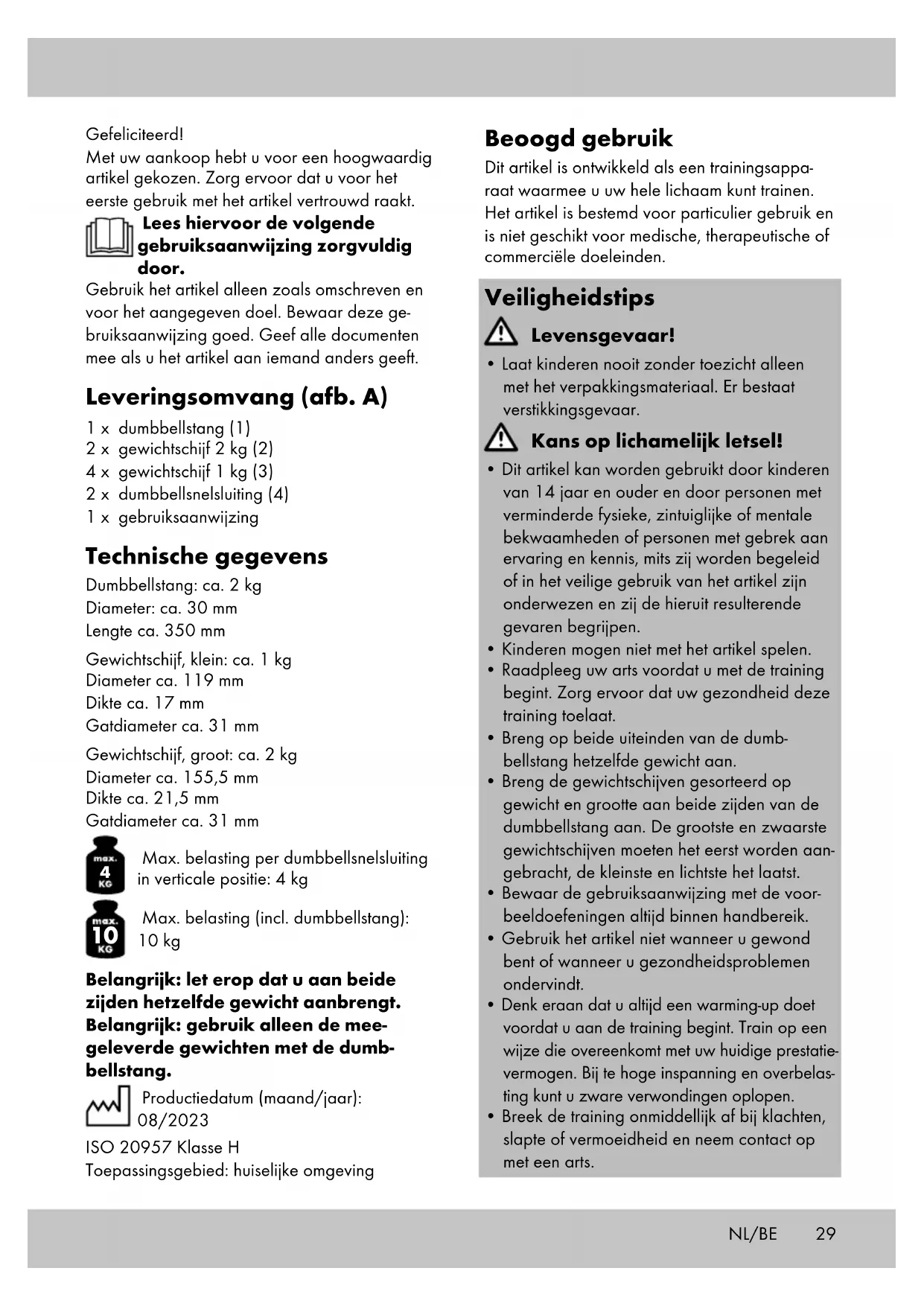 Max. belasting (incl. dumbbellstang): 10 kg Belangrijk: let erop dat u aan beide zijden hetzelfde gewicht aanbrengt. Belangrijk: gebruik alleen de mee- geleverde gewichten met de dumb- bellstang. Productiedatum (maand/jaar): 08/2023 ISO 20957 Klasse H Toepassingsgebied: huiselijke omgeving Beoogd gebruik Dit artikel is ontwikkeld als een trainingsappa- raat waarmee u uw hele lichaam kunt trainen. Het artikel is bestemd voor particulier gebruik en is niet geschikt voor medische, therapeutische of commerciële doeleinden. Veiligheidstips Levensgevaar!