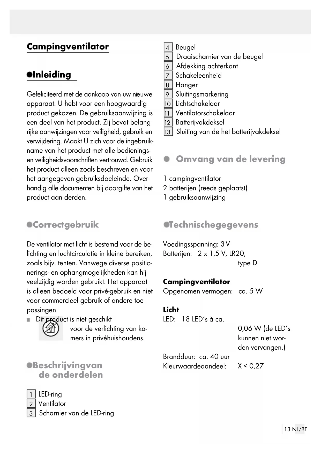 Sluiting van de het batterijvakdeksel Omvang van de levering 1 campingventilator 2 batterijen (reeds geplaatst) 1 gebruiksaanwijzing Technische gegevens Voedingsspanning: 3 V Batterijen: 2 x 1,5 V, LR20, type D Campingventilator Opgenomen vermogen: ca. 5 W Licht LED: 18 LED‘s à ca. 0,06 W (de LED‘s kunnen niet wor- den vervangen.) Brandduur: ca. 40 uur Kleurwaardeaandeel: X < 0,2714 NL/BE Veiligheidsinstructies