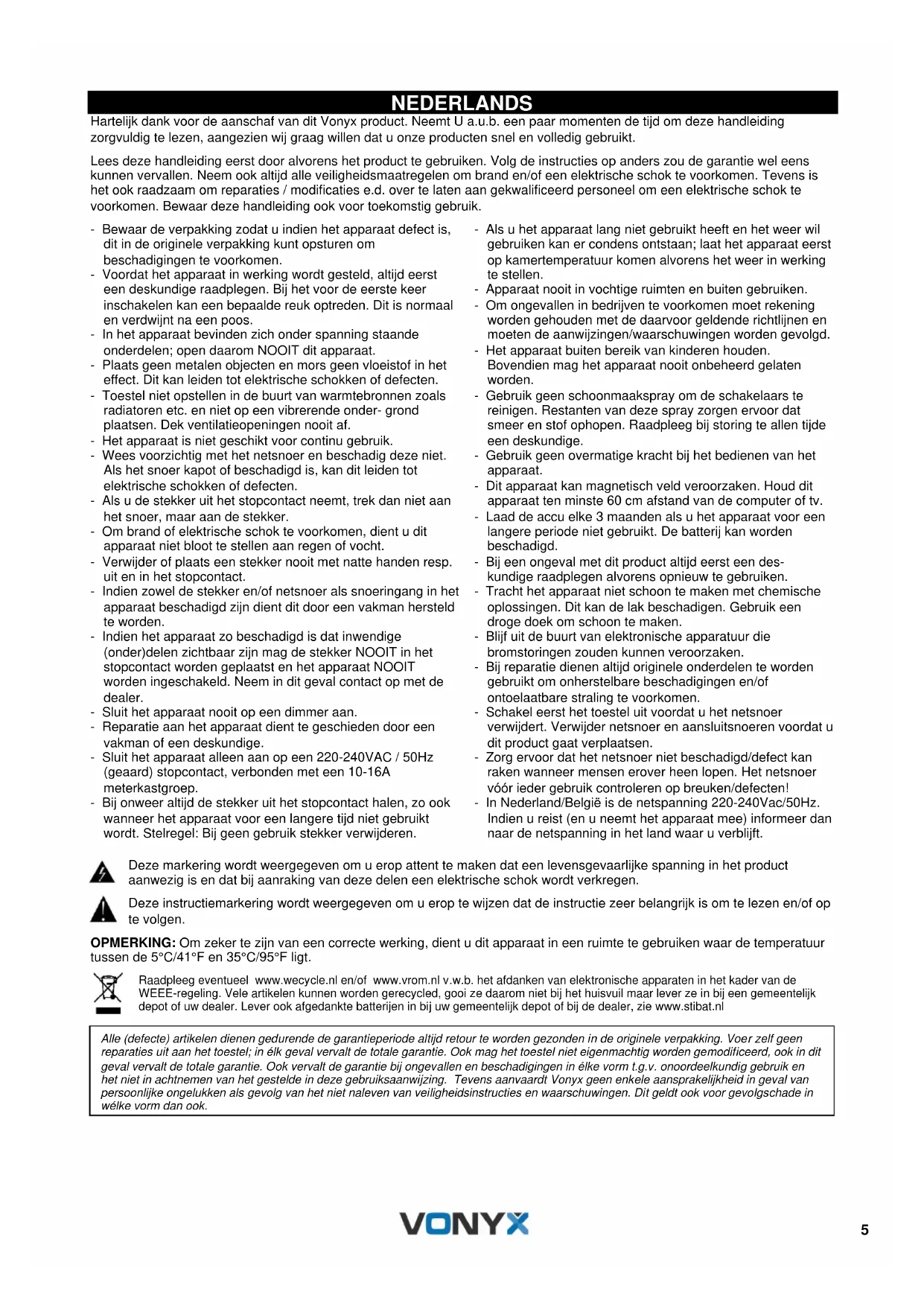 Belgium (BE), Denmark (DK), France (F), Finland (FI), Germany (DE), Hungary (HU), Italy (IT), Netherlands (NL), Norway (NO), Poland (PL), Portugal (PT), Romania (RO), Slovenia (SI), Spain (ES), Sweden (SE), Switzerland (CH), Great Britain (GB)5 NEDERLANDS Hartelijk dank voor de aanschaf van dit Vonyx product. Neemt U a.u.b. een paar momenten de tijd om deze handleiding zorgvuldig te lezen, aangezien wij graag willen dat u onze producten snel en volledig gebruikt. Lees deze handleiding eerst door alvorens het product te gebruiken. Volg de instructies op anders zou de garantie wel eens kunnen vervallen. Neem ook altijd alle veiligheidsmaatregelen om brand en/of een elektrische schok te voorkomen. Tevens is het ook raadzaam om reparaties / modificaties e.d. over te laten aan gekwalificeerd personeel om een elektrische schok te voorkomen. Bewaar deze handleiding ook voor toekomstig gebruik. - Bewaar de verpakking zodat u indien het apparaat defect is, dit in de originele verpakking kunt opsturen om beschadigingen te voorkomen. - Voordat het apparaat in werking wordt gesteld, altijd eerst een deskundige raadplegen. Bij het voor de eerste keer inschakelen kan een bepaalde reuk optreden. Dit is normaal en verdwijnt na een poos. - In het apparaat bevinden zich onder spanning staande onderdelen; open daarom NOOIT dit apparaat. - Plaats geen metalen objecten en mors geen vloeistof in het effect. Dit kan leiden tot elektrische schokken of defecten. - Toestel niet opstellen in de buurt van warmtebronnen zoals radiatoren etc. en niet op een vibrerende onder- grond plaatsen. Dek ventilatieopeningen nooit af. - Het apparaat is niet geschikt voor continu gebruik. - Wees voorzichtig met het netsnoer en beschadig deze niet. Als het snoer kapot of beschadigd is, kan dit leiden tot elektrische schokken of defecten. - Als u de stekker uit het stopcontact neemt, trek dan niet aan het snoer, maar aan de stekker. - Om brand of elektrische schok te voorkomen, dient u dit apparaat niet bloot te stellen aan regen of vocht. - Verwijder of plaats een stekker nooit met natte handen resp. uit en in het stopcontact. - Indien zowel de stekker en/of netsnoer als snoeringang in het apparaat beschadigd zijn dient dit door een vakman hersteld te worden. - Indien het apparaat zo beschadigd is dat inwendige (onder)delen zichtbaar zijn mag de stekker NOOIT in het stopcontact worden geplaatst en het apparaat NOOIT worden ingeschakeld. Neem in dit geval contact op met de dealer. - Sluit het apparaat nooit op een dimmer aan. - Reparatie aan het apparaat dient te geschieden door een vakman of een deskundige. - Sluit het apparaat alleen aan op een 220-240VAC / 50Hz (geaard) stopcontact, verbonden met een 10-16A meterkastgroep. - Bij onweer altijd de stekker uit het stopcontact halen, zo ook wanneer het apparaat voor een langere tijd niet gebruikt wordt. Stelregel: Bij geen gebruik stekker verwijderen. - Als u het apparaat lang niet gebruikt heeft en het weer wil gebruiken kan er condens ontstaan; laat het apparaat eerst op kamertemperatuur komen alvorens het weer in werking te stellen. - Apparaat nooit in vochtige ruimten en buiten gebruiken. - Om ongevallen in bedrijven te voorkomen moet rekening worden gehouden met de daarvoor geldende richtlijnen en moeten de aanwijzingen/waarschuwingen worden gevolgd. - Het apparaat buiten bereik van kinderen houden. Bovendien mag het apparaat nooit onbeheerd gelaten worden. - Gebruik geen schoonmaakspray om de schakelaars te reinigen. Restanten van deze spray zorgen ervoor dat smeer en stof ophopen. Raadpleeg bij storing te allen tijde een deskundige. - Gebruik geen overmatige kracht bij het bedienen van het apparaat. - Dit apparaat kan magnetisch veld veroorzaken. Houd dit apparaat ten minste 60 cm afstand van de computer of tv. - Laad de accu elke 3 maanden als u het apparaat voor een langere periode niet gebruikt. De batterij kan worden beschadigd. - Bij een ongeval met dit product altijd eerst een des- kundige raadplegen alvorens opnieuw te gebruiken. - Tracht het apparaat niet schoon te maken met chemische oplossingen. Dit kan de lak beschadigen. Gebruik een droge doek om schoon te maken. - Blijf uit de buurt van elektronische apparatuur die bromstoringen zouden kunnen veroorzaken. - Bij reparatie dienen altijd originele onderdelen te worden gebruikt om onherstelbare beschadigingen en/of ontoelaatbare straling te voorkomen. - Schakel eerst het toestel uit voordat u het netsnoer verwijdert. Verwijder netsnoer en aansluitsnoeren voordat u dit product gaat verplaatsen. - Zorg ervoor dat het netsnoer niet beschadigd/defect kan raken wanneer mensen erover heen lopen. Het netsnoer vóór ieder gebruik controleren op breuken/defecten! - In Nederland/België is de netspanning 220-240Vac/50Hz. Indien u reist (en u neemt het apparaat mee) informeer dan naar de netspanning in het land waar u verblijft.