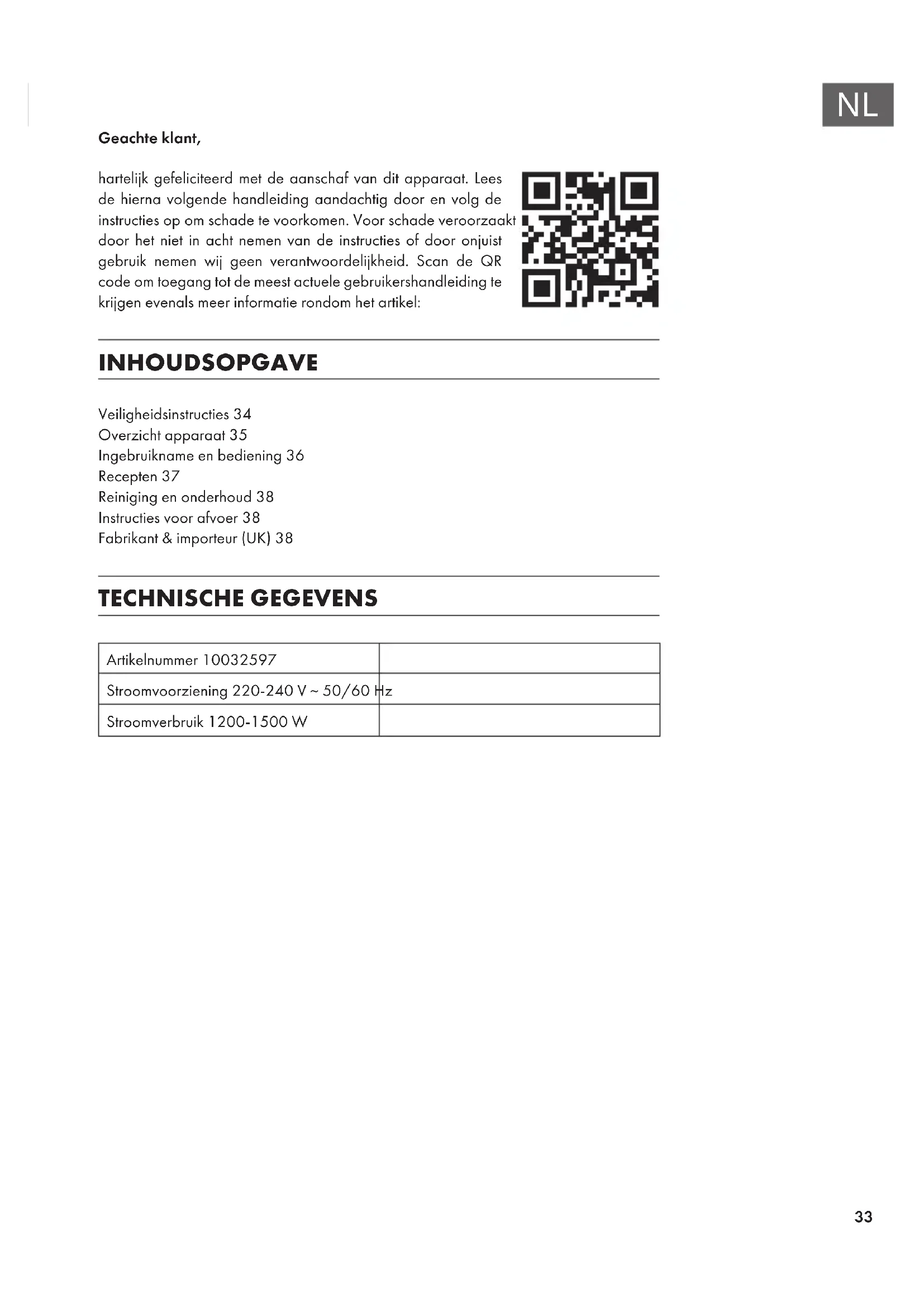 Geachte klant, hartelijk gefeliciteerd met de aanschaf van dit apparaat. Lees de hierna volgende handleiding aandachtig door en volg de instructies op om schade te voorkomen. Voor schade veroorzaakt door het niet in acht nemen van de instructies of door onjuist gebruik nemen wij geen verantwoordelijkheid. Scan de QR code om toegang tot de meest actuele gebruikershandleiding te krijgen evenals meer informatie rondom het artikel: INHOUDSOPGAVE Veiligheidsinstructies34 Overzicht apparaat35 Ingebruikname en bediening36 Recepten37 Reiniging en onderhoud38 Instructies voor afvoer38 Fabrikant & importeur (UK)38 TECHNISCHE GEGEVENS Artikelnummer 10032597 Stroomvoorziening 220-240 V ~ 50/60 Hz Stroomverbruik 1200-1500 W34