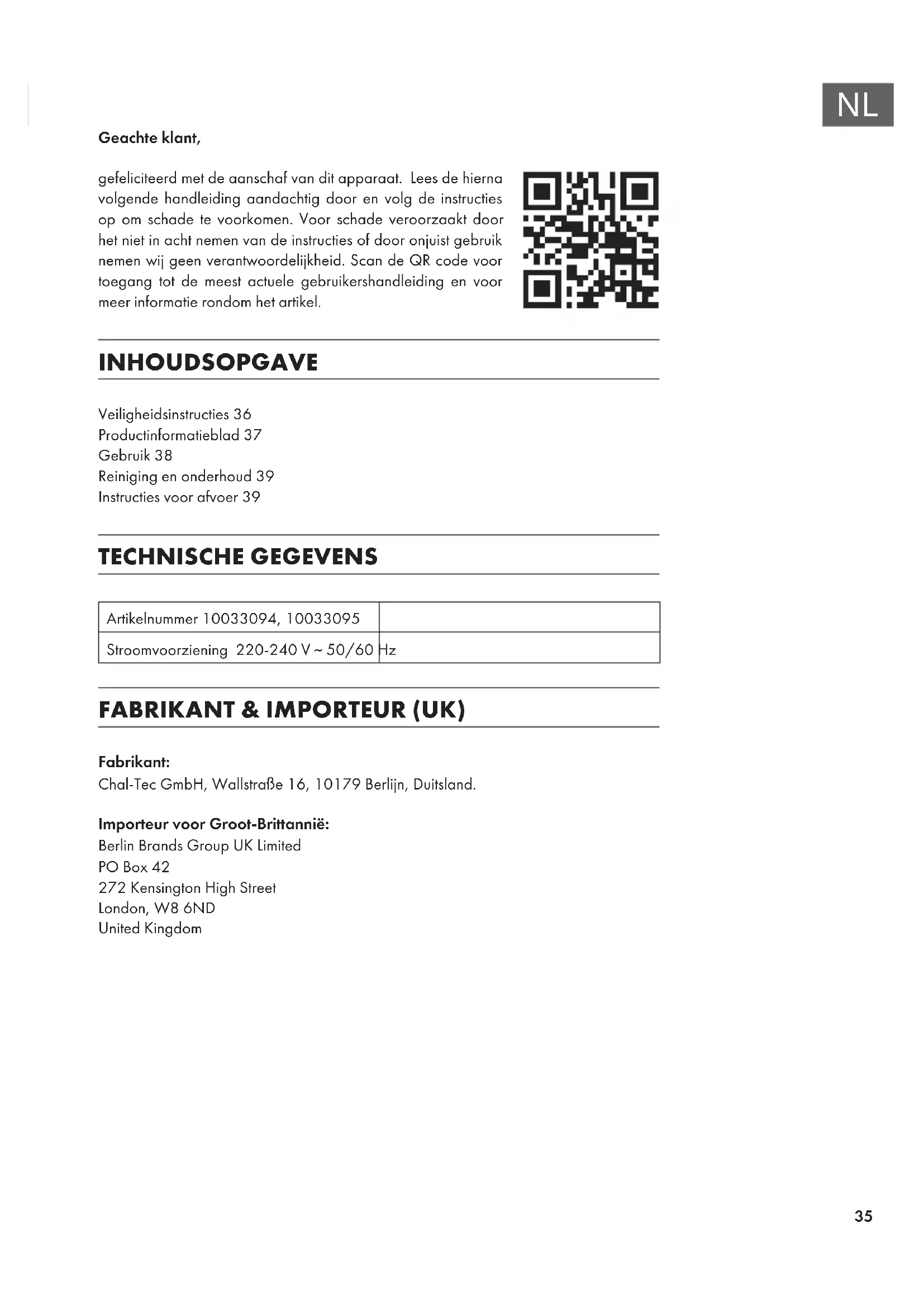 Geachte klant, gefeliciteerd met de aanschaf van dit apparaat. Lees de hierna volgende handleiding aandachtig door en volg de instructies op om schade te voorkomen. Voor schade veroorzaakt door het niet in acht nemen van de instructies of door onjuist gebruik nemen wij geen verantwoordelijkheid. Scan de QR code voor toegang tot de meest actuele gebruikershandleiding en voor meer informatie rondom het artikel. INHOUDSOPGAVE Veiligheidsinstructies36 Productinformatieblad37 Gebruik38 Reiniging en onderhoud39 Instructies voor afvoer39 TECHNISCHE GEGEVENS Artikelnummer 10033094, 10033095 Stroomvoorziening 220-240 V ~ 50/60 Hz FABRIKANT & IMPORTEUR (UK) Fabrikant: Chal-Tec GmbH, Wallstraße 16, 10179 Berlijn, Duitsland. Importeur voor Groot-Brittannië: Berlin Brands Group UK Limited PO Box 42 272 Kensington High Street London, W8 6ND United Kingdom36
