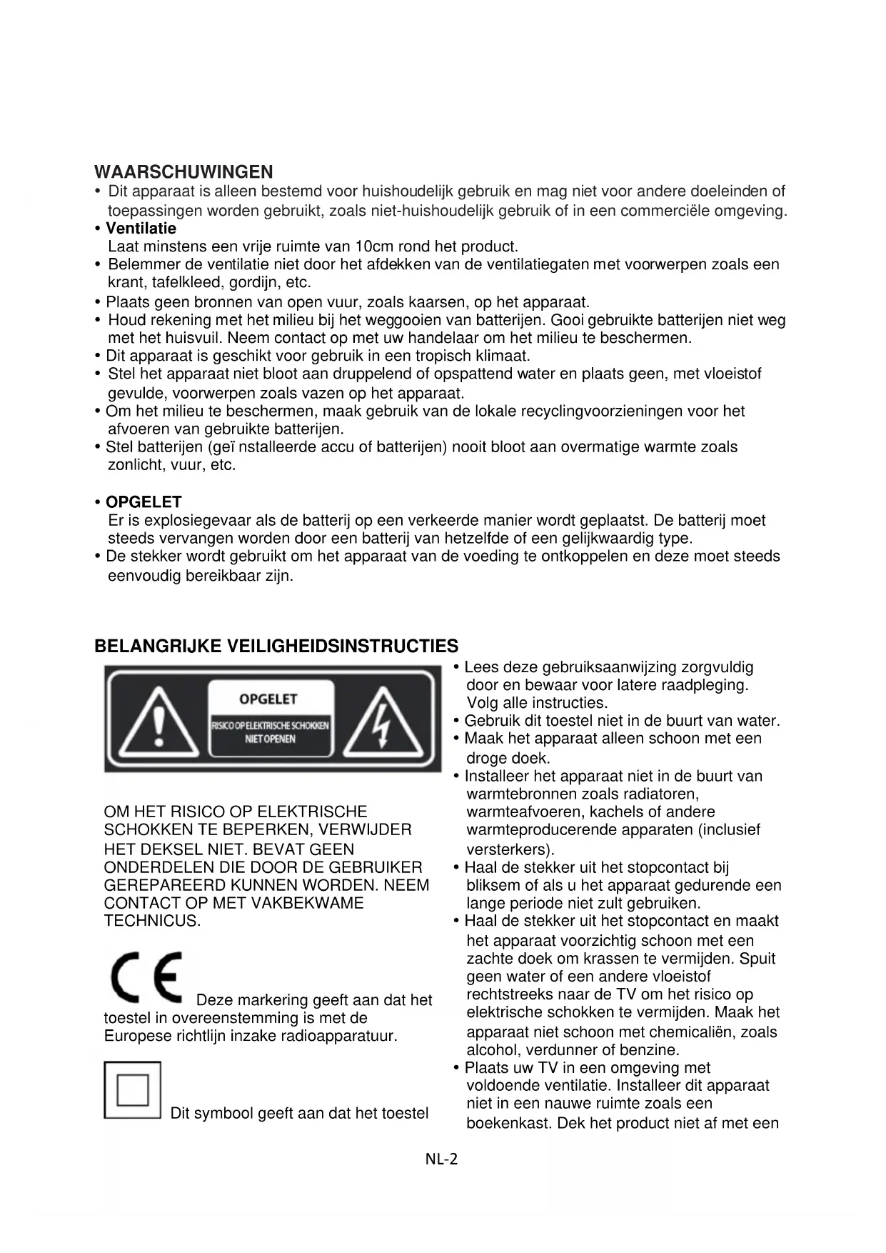 TECHNICUS. Deze markering geeft aan dat het toestel in overeenstemming is met de Europese richtlijn inzake radioapparatuur. Dit symbool geeft aan dat het toestel Lees deze gebruiksaanwijzing zorgvuldig door en bewaar voor latere raadpleging. Volg alle instructies. Gebruik dit toestel niet in de buurt van water. Maak het apparaat alleen schoon met een droge doek. Installeer het apparaat niet in de buurt van warmtebronnen zoals radiatoren, warmteafvoeren, kachels of andere warmteproducerende apparaten (inclusief versterkers). Haal de stekker uit het stopcontact bij bliksem of als u het apparaat gedurende een lange periode niet zult gebruiken. Haal de stekker uit het stopcontact en maakt het apparaat voorzichtig schoon met een zachte doek om krassen te vermijden. Spuit geen water of een andere vloeistof rechtstreeks naar de TV om het risico op elektrische schokken te vermijden. Maak het apparaat niet schoon met chemicaliën, zoals alcohol, verdunner of benzine. Plaats uw TV in een omgeving met voldoende ventilatie. Installeer dit apparaat niet in een nauwe ruimte zoals een boekenkast. Dek het product niet af met eenNL-3 van dubbele isolatie is voorzien.